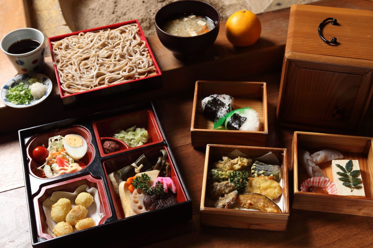 地元の飲食店のケータリングを頼むプランも選べます。今回のメニューは「そば道場」のもの。祖谷の気候はそばの栽培に適していて、地元では昔からそばが食べられてきました。内容は、香り高い祖谷そばと、そばの実を使った「そば米雑炊」を中心に、ゴウシイモなどの地野菜の天ぷらや煮物など、地元の味覚がたっぷり詰まっています。豪華なお重にもテンションが上がります(ケータリングの店は選べません)。