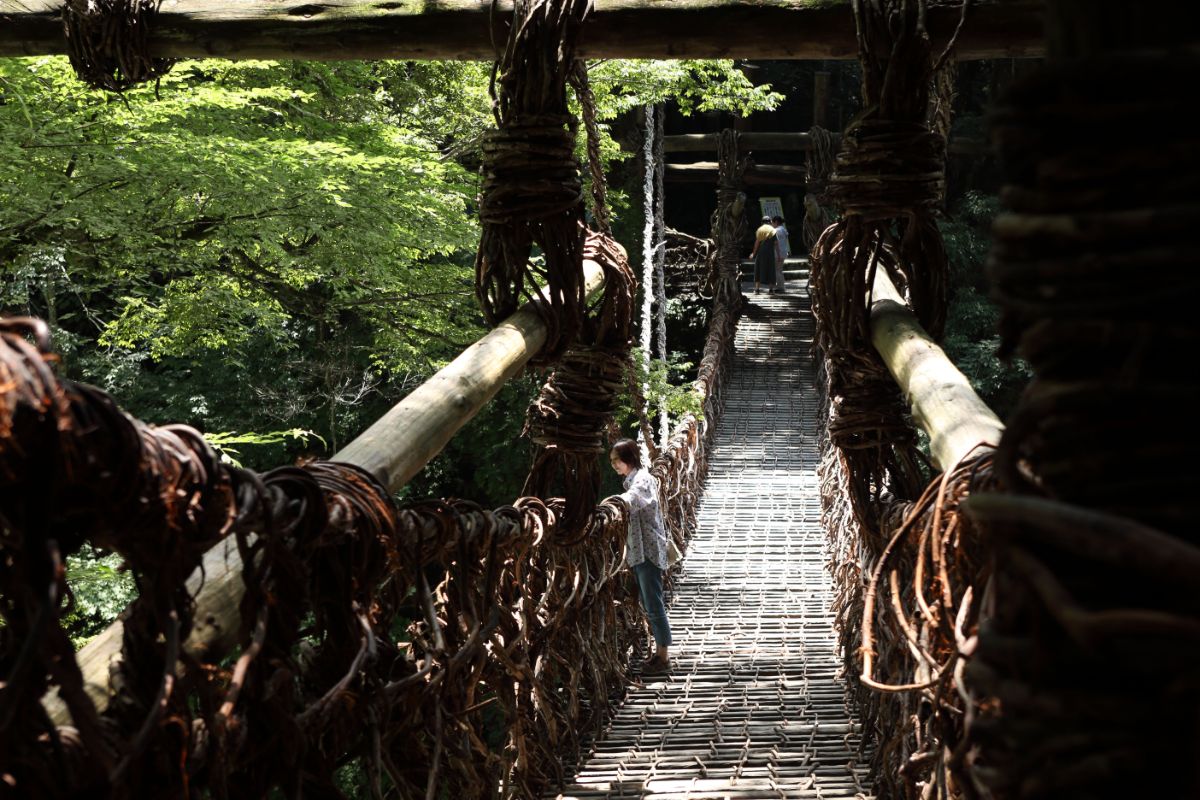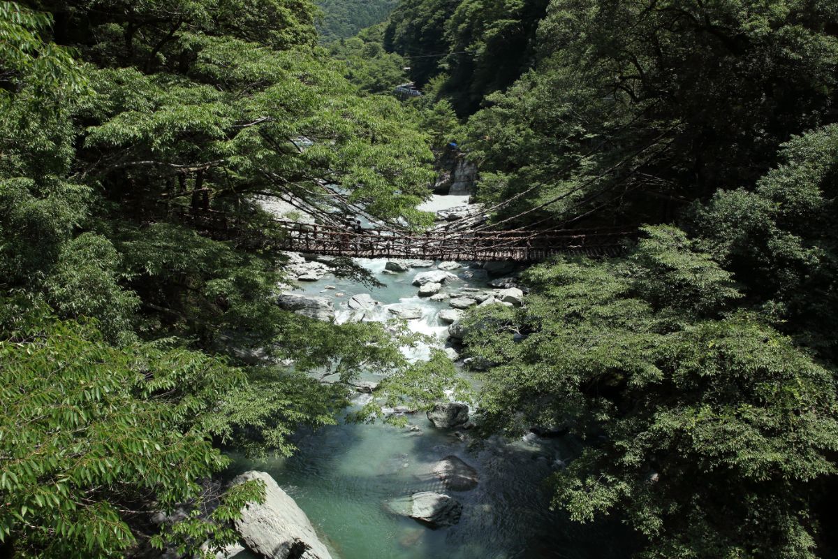 秘境・祖谷を代表する名所といえば祖谷川に架かる「祖谷のかずら橋」。かずら橋は、自生するシラクチカズラを編んで作られたこの地方独特の吊橋です。かつてはこの地に暮らす人々の日常の通行路でしたが、現在は観光名所となり、国の重要有形民俗文化財に指定されています。平家の落人がこの地に落ち延びた際、追手が来た時にすぐに落とせるように簡素な作りにしたという伝説も。