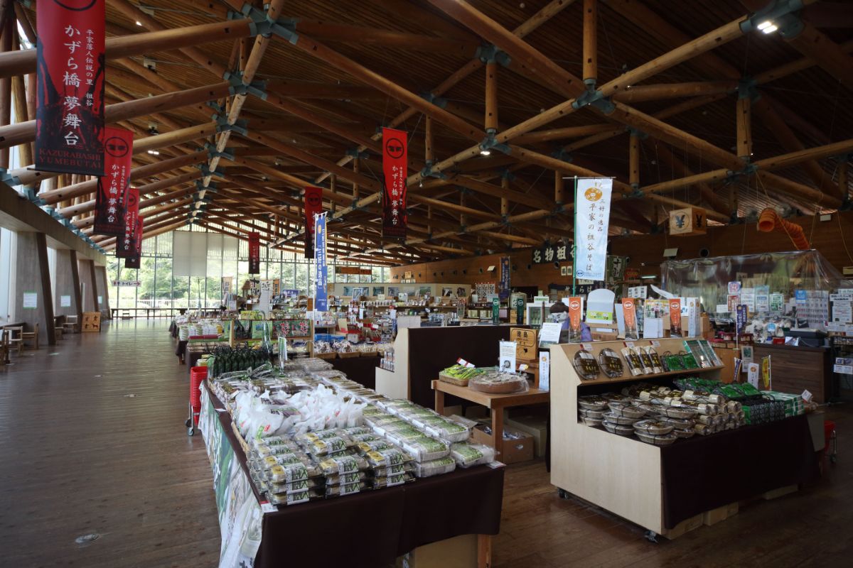 「祖谷のかずら橋」に隣接する「かずら橋夢舞台」では、名物の祖谷そばをいただけるほか、祖谷そばの生麺やそばの実、祖谷の番茶、こんにゃく、すだち製品など、ここでしか手に入らない特産品を販売しています。外には「でこまわし」という地元の串料理やアメゴの串焼きを販売する露店も出ています。吊橋のスリルを味わったあとは、串を片手に休憩を。