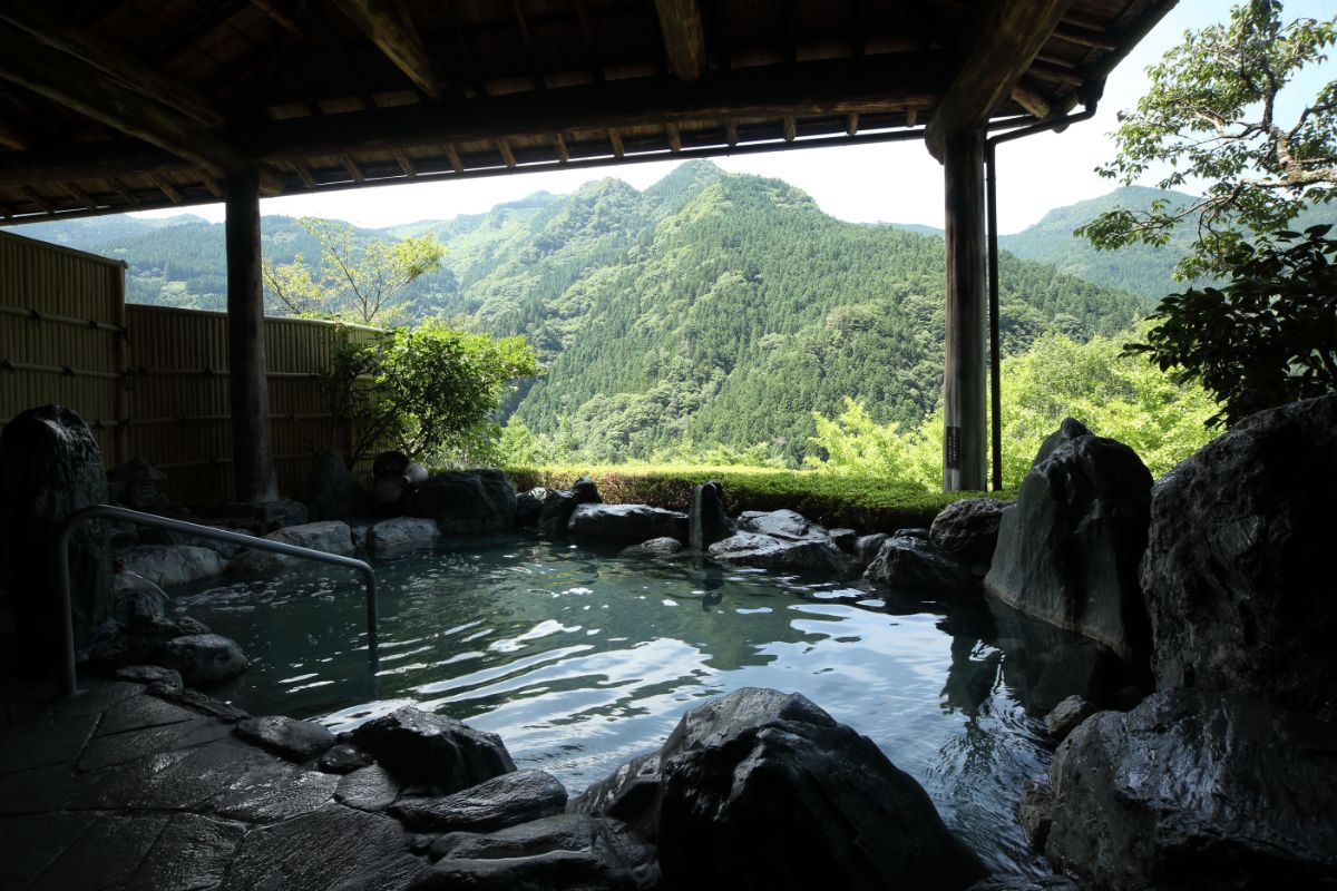 標高約400mにある男性風呂「雲海の湯」から望む祖谷渓谷はまさに絶景。みずみずしい緑のシーズンも爽快な気分になれますが、11月頃には湯船から紅葉の渓谷美を堪能することもできます。泉質は単純硫黄泉。疲労回復や冷え性、関節痛や筋肉痛に効能が望めるとか。ゆっくり浸かれば移動の疲れも癒やせます。