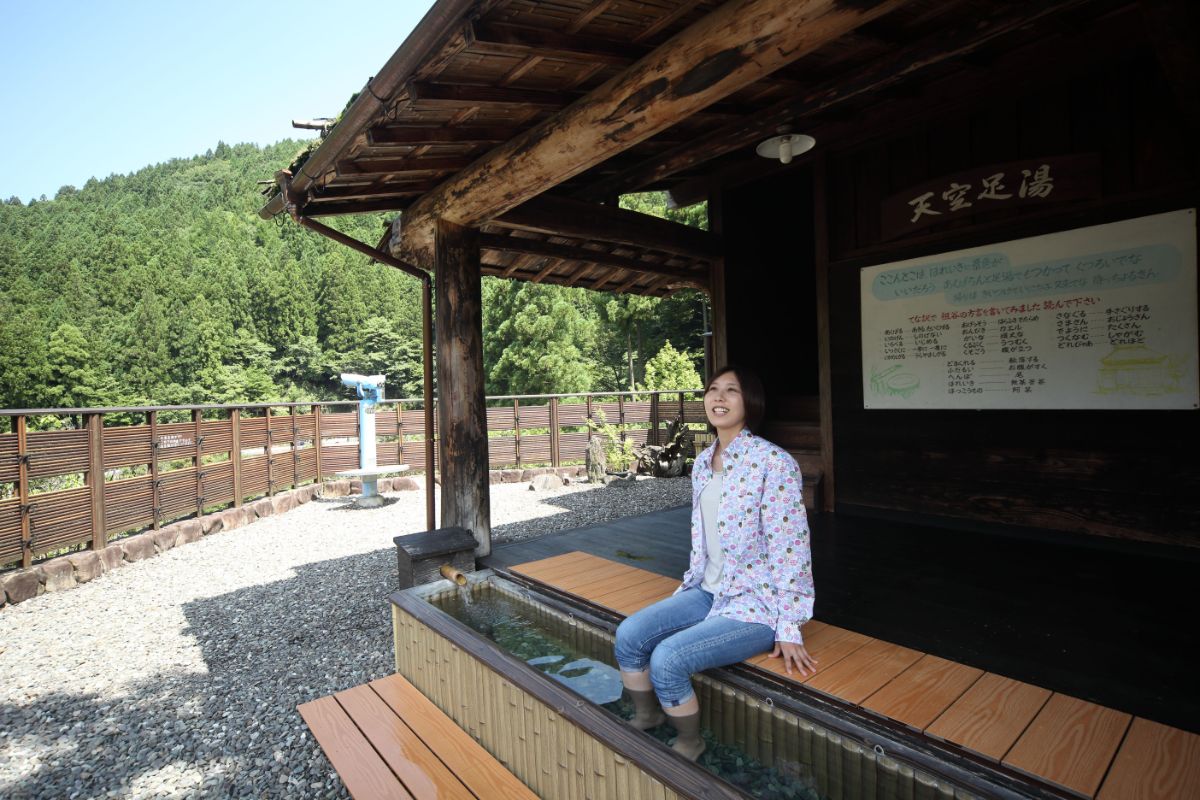祖谷川を望む展望台と、足湯からの眺めも抜群。ウォーターサーバーには、祖谷の湧水が用意されているのもポイントです。湯上がりに、清冽な湧水で喉を潤すのは最高の贅沢。足湯を楽しんだら、裏にある茅葺き屋根の休憩所で一服を。