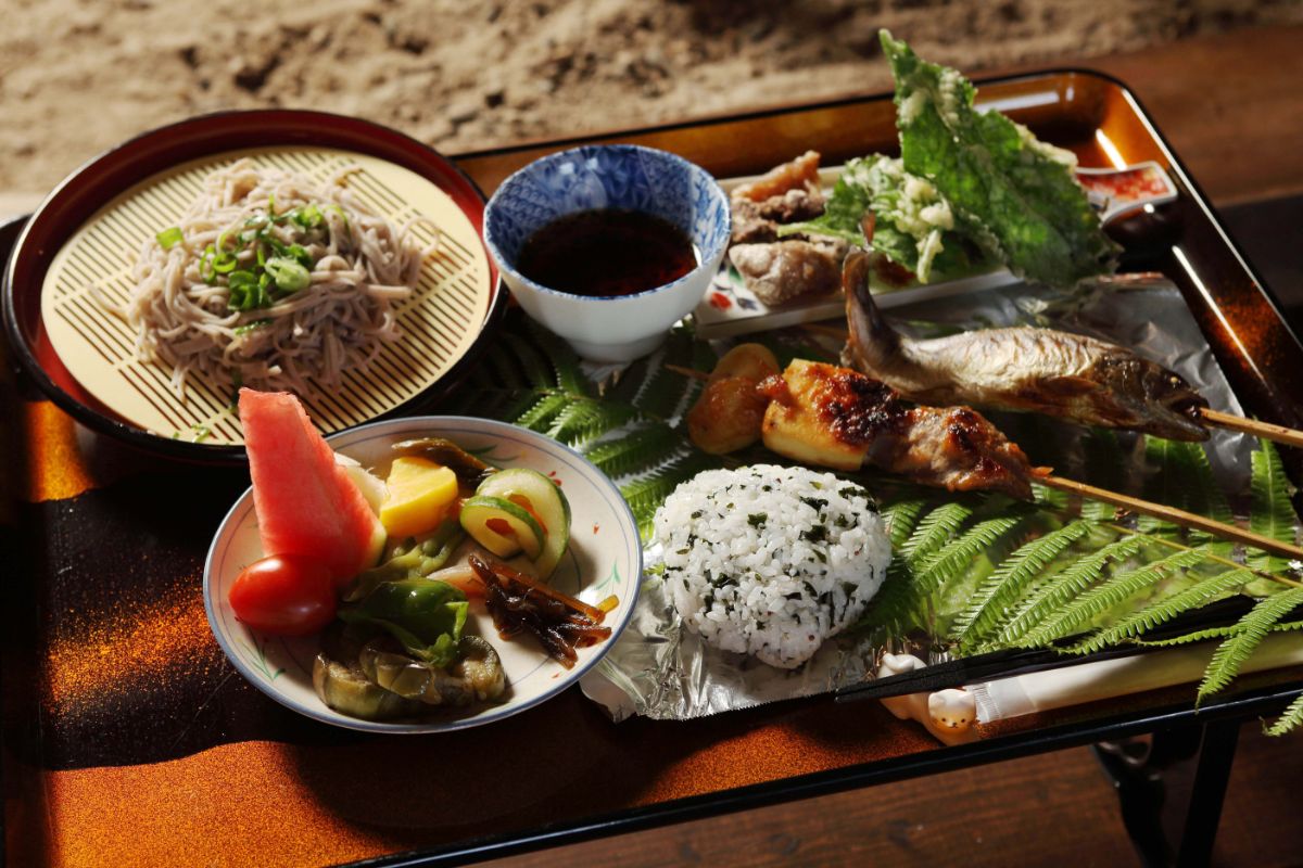 膳には、祖谷の郷土料理が並びます。歯ごたえのあるイモと豆腐に、山椒とニンニクで風味づけされた味噌をつけていただく「でこまわし」や、香ばしいアメゴの串焼きを中心に、祖谷そば、季節の山菜の天ぷら、鹿肉の竜田揚げ、こんにゃくの唐揚げ、傾斜地農法でとれた野菜のおかずなどが脇をかためます。素朴な調理法が、素材の濃厚な味わいを引き立てて美味。
