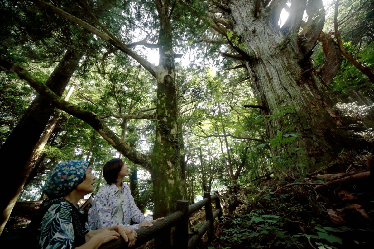 ランチをいただいたあと、都築さんと一緒に隣接する森を散策していると、特別な存在感を放つ巨樹に遭遇。樹高約35m、樹周約11m。その生命力に思わず圧倒されました。平国盛(たいらのくにもり)が、鉾を奉納して鉾神社を祀るために植えたと伝えられています。