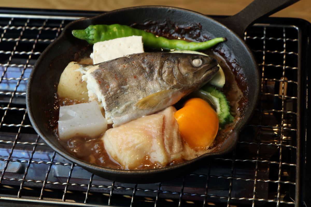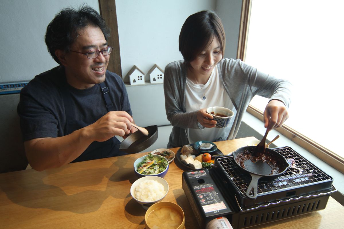 ワークショップでは、「ひらら」の代わりにスキレットを使います。オリジナルの味噌を、スキレットのヘリに塗って、土手の代わりに。アメゴや鶏肉、ジビエ、ゴウシイモやこんにゃく、伝統農法で育った野菜などの具材を並べたら、だしを入れて煮込みます。ぐつぐつと沸き立って香ばしい匂いがしてきたら食べ頃。やさしい味噌味が染みた食材は、ご飯にもお酒にも相性抜群です! 最後にご飯を投入してチーズをトッピングすれば濃厚な味わいのリゾットのできあがり。