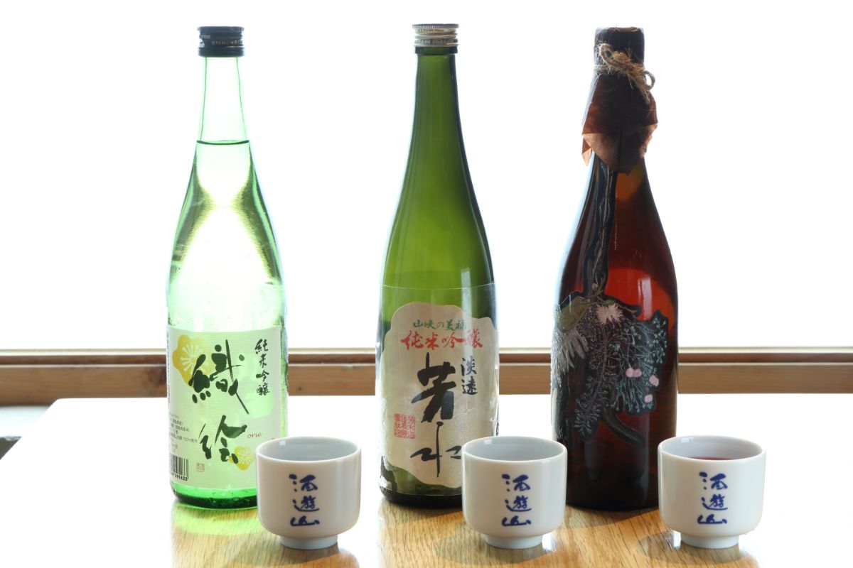 三好市にある、中和商店、三芳菊酒造、芳水酒造という3つの日本酒の蔵元と、2021年に誕生したばかりのNatan葡萄酒醸造所というワイナリーのお酒の飲み比べをオプションで追加することもできます。写真は右からNatan葡萄酒醸造所のロゼワイン「quvi」、芳水酒造の純米吟醸「淡遠」、三芳菊酒造の純米吟醸「織絵」。説明を聞いて、自分好みの3種類を選んでみて。