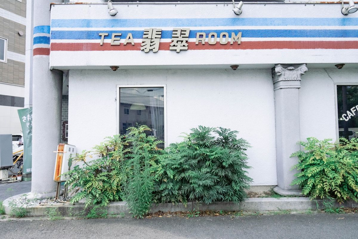 コンクリート造りのどっしりとした佇まい、3本線がデザインされたレトロ感、“TEA ROOM”の軽やかな響きなど、喫茶店好きにはたまらない雰囲気。入る前からワクワク感が高まります。