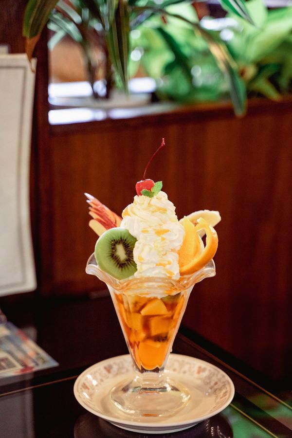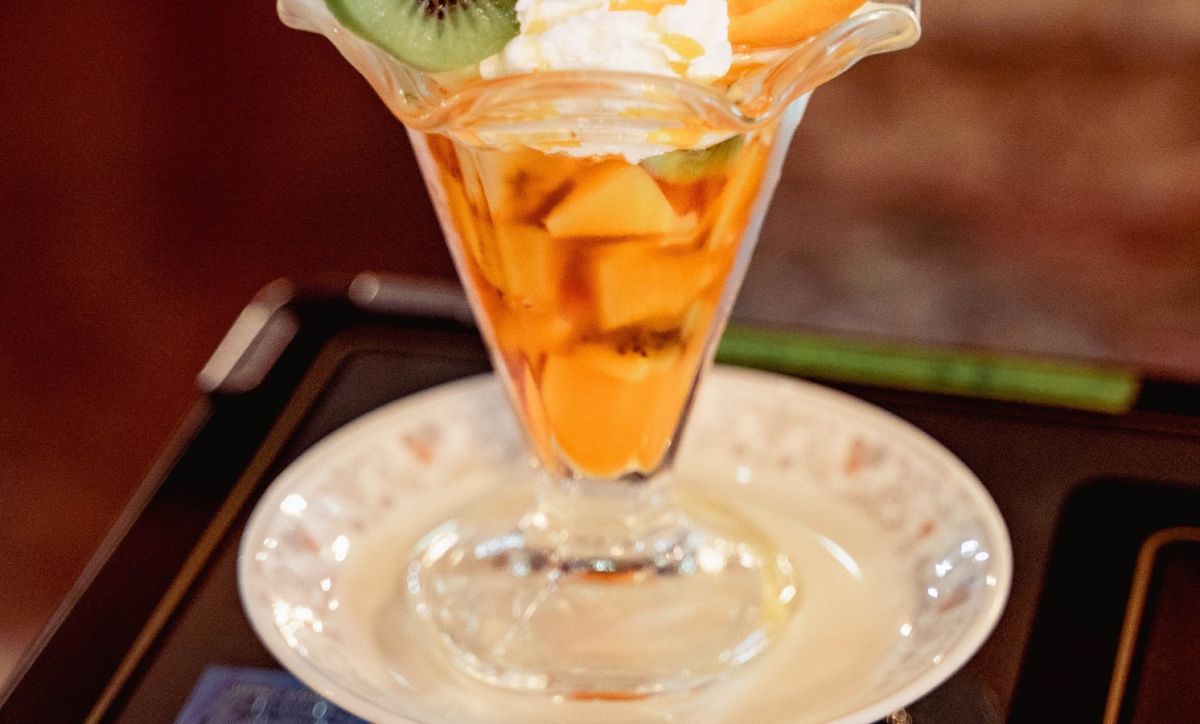 グラスの中身は、カットしたオレンジ、リンゴ、キウイ、バナナとオレンジソース。その上に生クリームを盛り、バニラアイスを2玉とフルーツをかわいらしくトッピング。パフェ全体に甘酸っぱいオレンジソースが絡まり、最後まで飽きずにおいしく食べられると評判です。