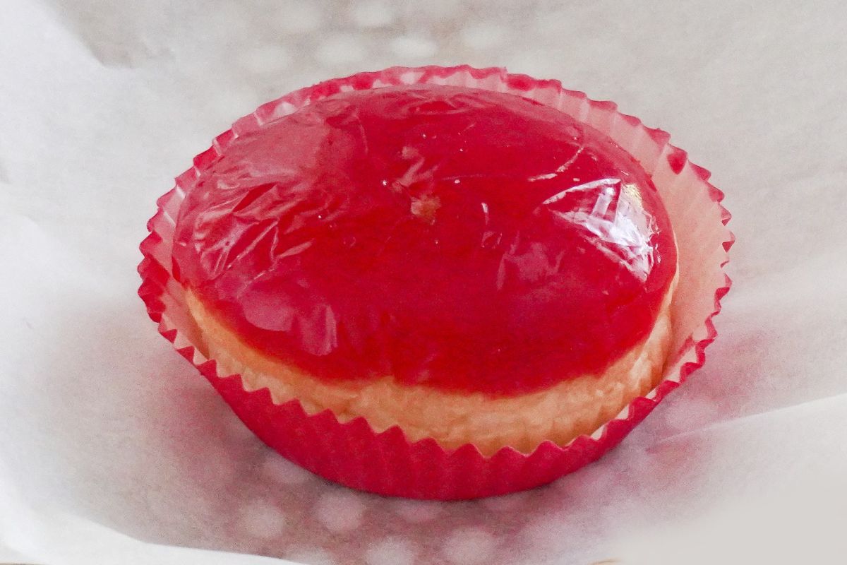 袋から取り出すと、赤いカップの上にのったパンは、ツヤツヤ、テカテカぶりがさらにアピールされ、「私を見て!」と迫ってくるようです。その直径は9㎝弱。パン生地の表面が、りんご風味の赤いゼリーでコーティングされています。