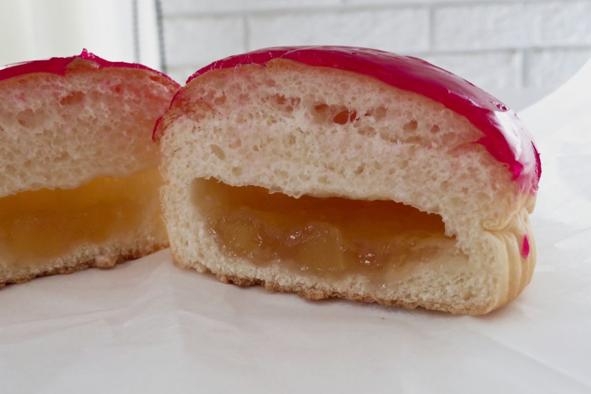 パンをカットしてみると、ふんわりとしたパン生地の下の方に、りんごジャムが入っています。ジャムの中にはダイスカットされたりんごの果肉も入っています。 見た目は大きなりんご飴、味は甘〜いりんごジャム入りのパンといったところでしょうか。