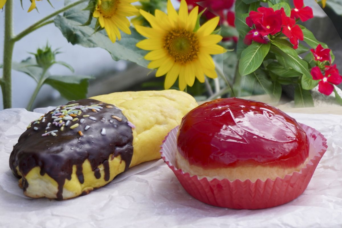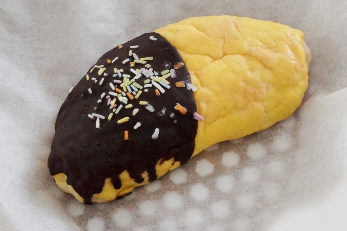 本家のチョコバナナは、皮をむいたバナナ丸ごと一本に、縦方向に割り箸を刺し、溶かしたチョコレートをからめて、トッピングをまぶして冷やし固めたもの。「チョコバナナみたいなパン」は、本物よりちょっと太め。一番長いところが15㎝ほど。パッと見、オムライスに見えなくもありませんが、半分はバナナの黄色、半分にチョコがかかっていて、その上にカラフルなスプレーチョコがトッピングされています。クンクン匂いをかいでみると、ほんのりバナナの甘酸っぱい香りがします。
