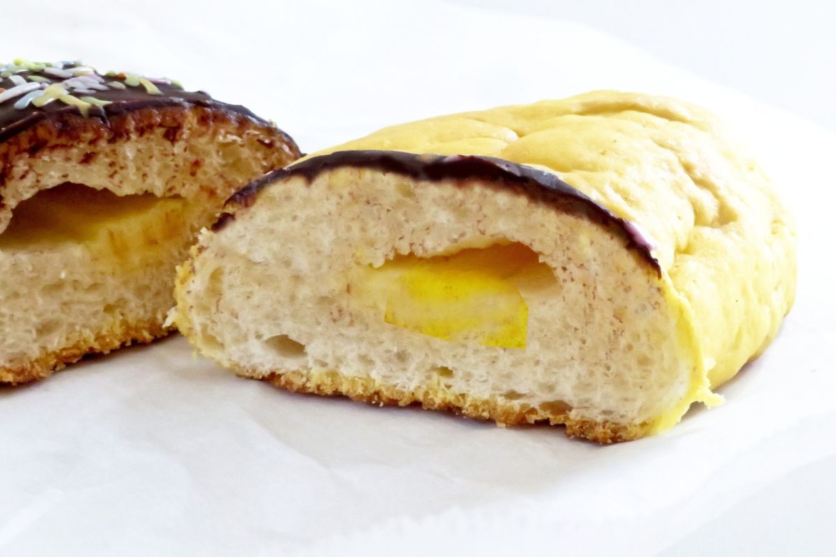 こちらもカットしてみました。パン生地の上に、メロンパンのような感じでバナナ色の生地がのり、中にはクリームが入っています。 一口かじると、鼻に抜ける香りはチョコバナナそのもの。パンは、ややみっちりとした食感で、パンの上の黄色い部分はバナナ風味。なかのクリームはバナナ果汁入りの甘くねっとりとした味わいです。個人的には、チョコとバナナクリームが一緒に食べられる部分がいい感じです。