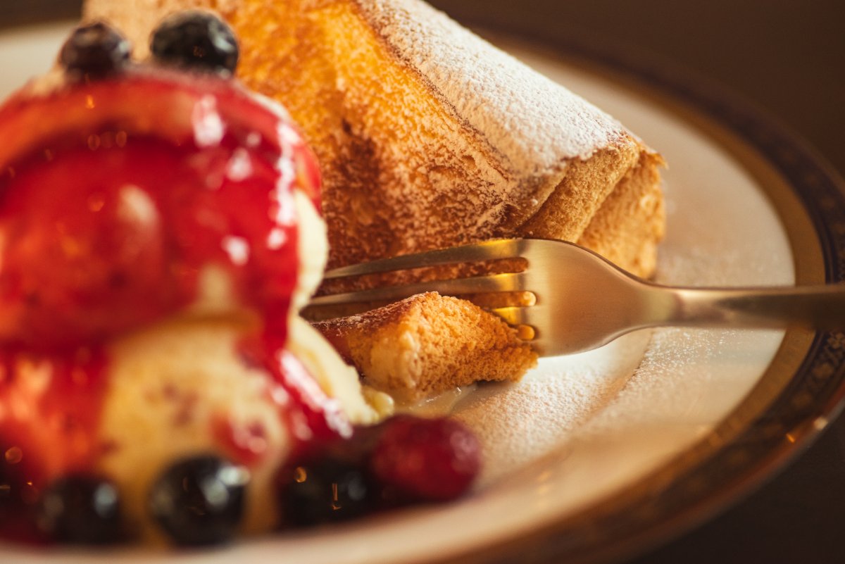 フォークを入れてみると、表面はさっくりと焼き上がり、中はふわっとした食感。 添えられた生クリームは甘さ控えめでミルク感が強いため、最後の一口まで飽きることなく美味しくいただけました。