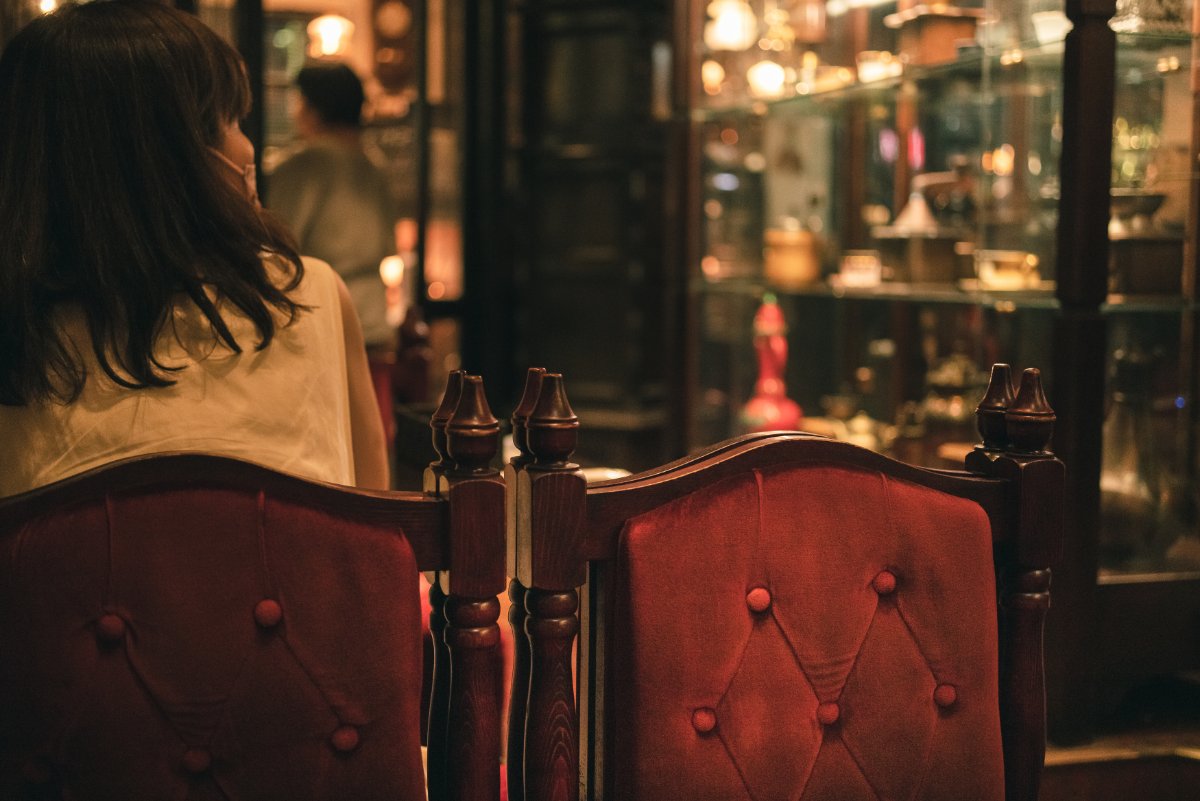 真紅のベロアが張られたソファ席、中央の丸いテーブル、そしてゆったりとした曲線を描くカウンター席。心地よいバロック音楽が、席に着いた瞬間から私たちを非日常へと連れていきます。