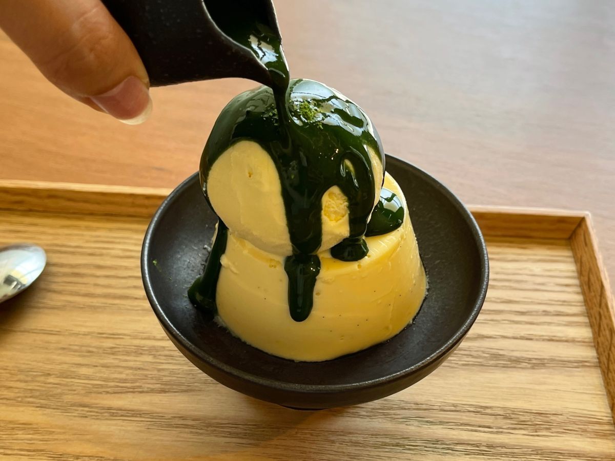 プリンとバニラアイスが重なって、まるでオブジェのよう!