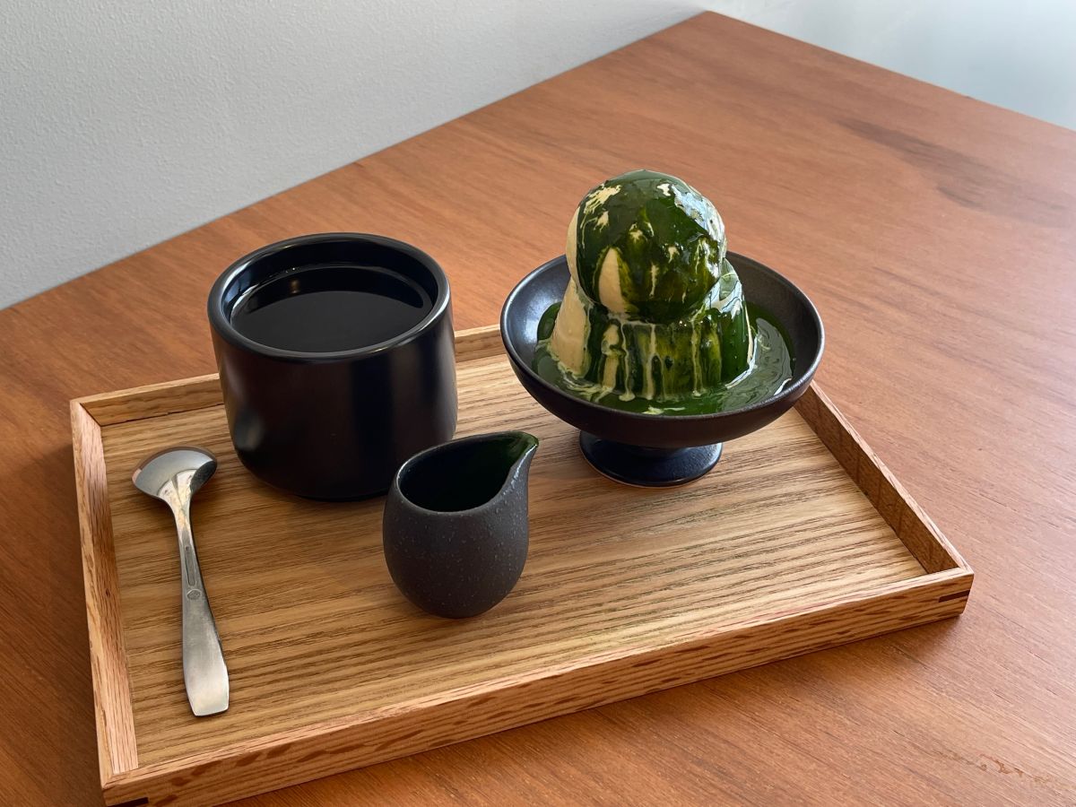 コーヒーは持ち手のないマットブラックのカップで提供され、スタイリッシュでおしゃれ!