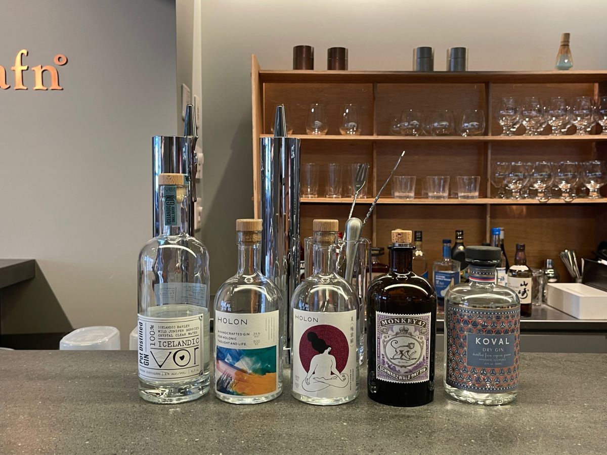 カウンターにはクラフトジンがずらっと。ほかではあまり置いていないものが揃っているのだそう。例えば一番左の「vor(フォア)」というアイスランドのクラフトジンは、なかなか手に入れられないレア物。アイスランド語で「春」を意味し、さわやかなハーブが使われているお酒です。