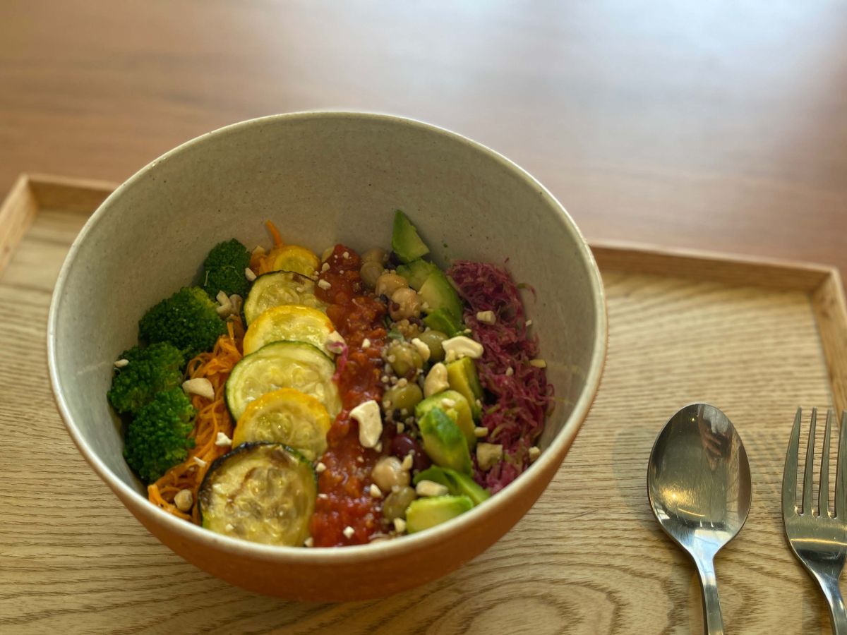ブロッコリーやニンジンのラペ、アボカドなどの野菜や、キヌアや玄米などの穀物が入っており、素材はすべてヴィーガン。しっかり咀嚼できるので満足感たっぷりです。