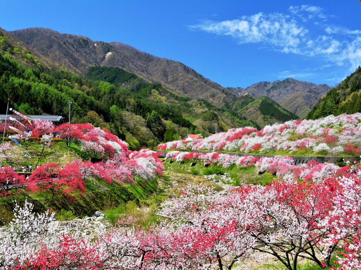 伊那谷~木曽谷を結ぶ国道256号の街道沿いには、数千本の花桃が植栽されていて、赤白ピンク3色のかわいい花を咲かせることから、通称「はなもも街道」とよばれています。特に月川温泉郷周辺の「花桃の里」はまさに桃源郷のような美しさ。昼神温泉郷では、4月上旬~中旬にかけて「昼神花まつり」が、4月中旬~5月上旬にかけては月川温泉郷にて「花桃まつり」が開催され、多くの観光客が訪れます。