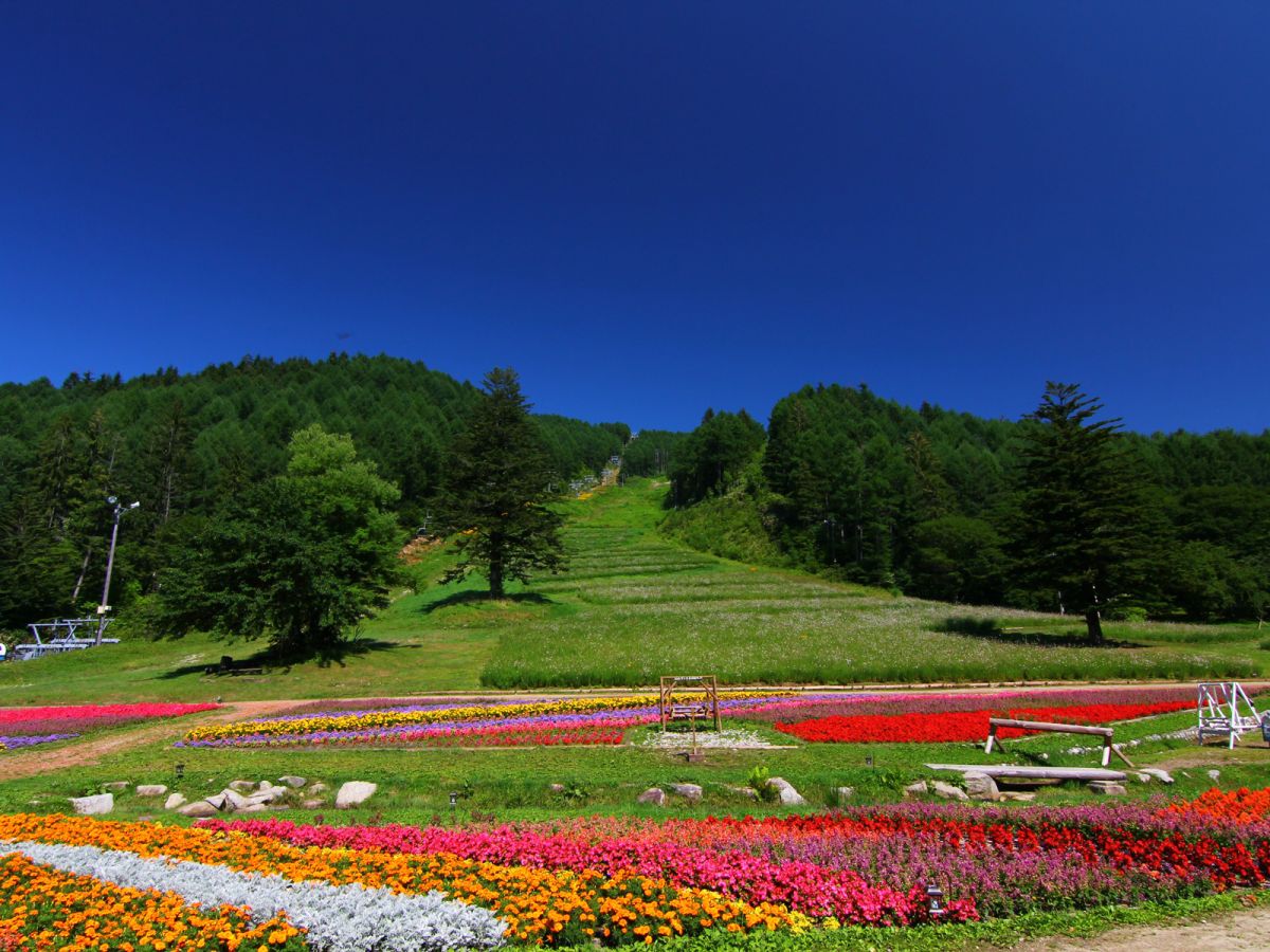 山麓駅から標高1400mにある山頂駅までロープウェイを利用して天空の楽園へ! 園内ではリフトで上る展望デッキ「ソライロ」があり、南アルプスの絶景が望めるほか、ベコニアが足もとに広がるペアリフトで優雅な空中散歩も楽しめます。夏になると色とりどりの花々が咲き乱れ、秋は山頂の白い雪、中腹の赤く紅葉した木々、麓の緑の針葉樹が織りなす三段紅葉を見ることができます。冬期はスキー場「ヘブンスそのはらSNOW WORLD」として営業しています。