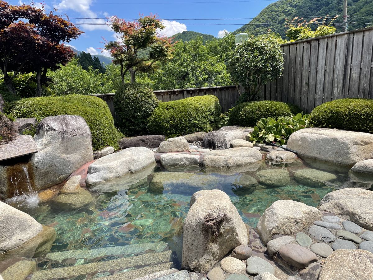 古代より多くの歌人に詠まれてきた園原に湧く月川温泉は、春には桃の花に包まれる「野熊の庄 月川」が一軒宿。宿泊のほか、日帰りでも入浴可能(11~16時、不定休。大人800円)。pH9.0の肌がつるつるになる温泉が、石造りの内湯や岩を組んだ露天風呂で楽しめます。
