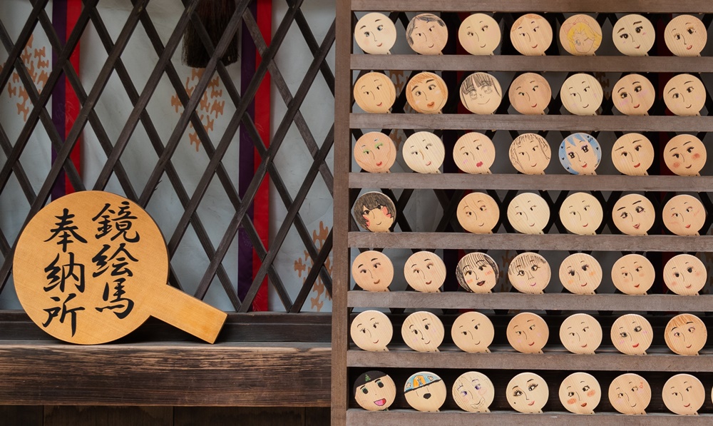 こちらがその鏡絵馬。手鏡の形の絵馬には、顔が描かれており、自身の化粧品や色鉛筆を用いて自分の顔を描きます。裏には願い事を記入しましょう。この絵馬を奉納すると、身も心も美しくなると言われています。