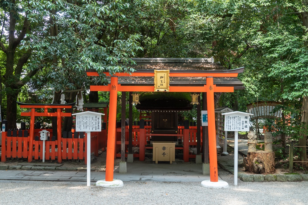 下鴨神社の入口である楼門前に佇むのがこちらの相生社(あいおいのやしろ)。相生社には、神皇産霊神(かみむすびのかみ)という縁結びの神様が祭られており、様々な良縁が祈願される場所です。左側には縁結びの社の神徳を表すものとして、2本の木が1本に結ばれた連理の榊(れんりのさかき)が。縁結びのほか、安産や育児、家庭円満のご利益があるとされ、多くの人がパワースポットとして訪れています。