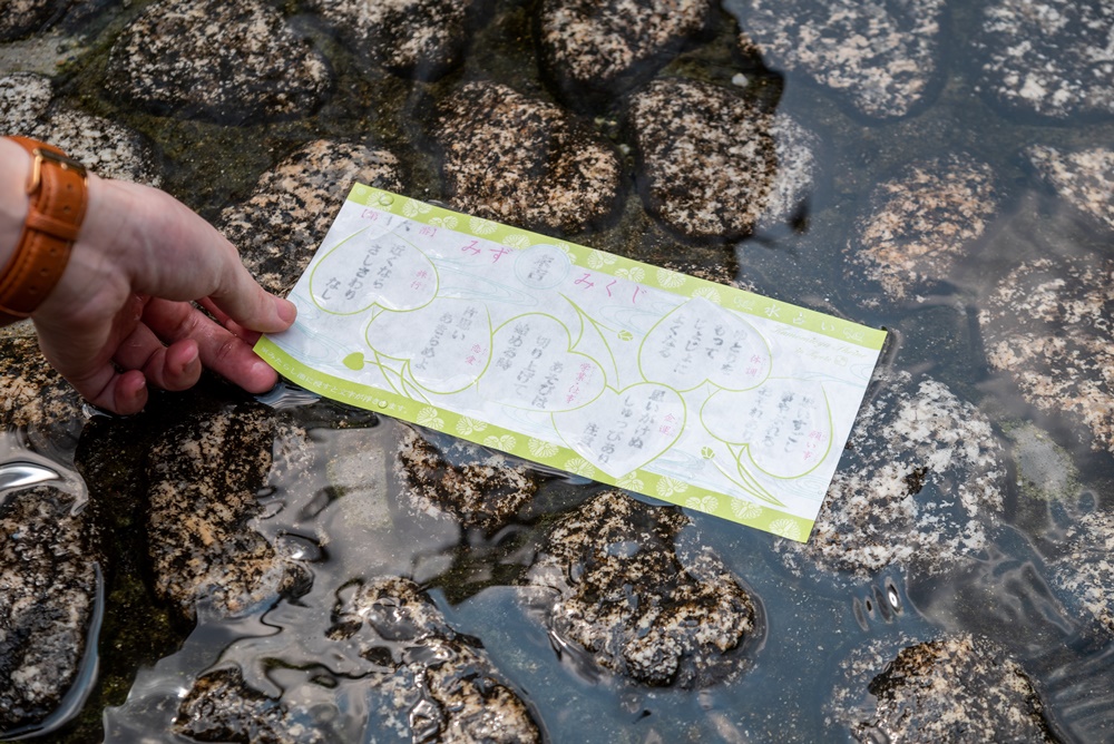 御手洗社にある授与所では、水みくじを行うことができます。下鴨神社の神紋である双葉葵が散りばめられたかわいいデザインに心躍りますね。御手洗池に浸すと結果が浮き出るという仕組みになっているので、水に浸ける瞬間もドキドキで、文字が浮かび上がる様子を眺めるのも楽しいですよ。