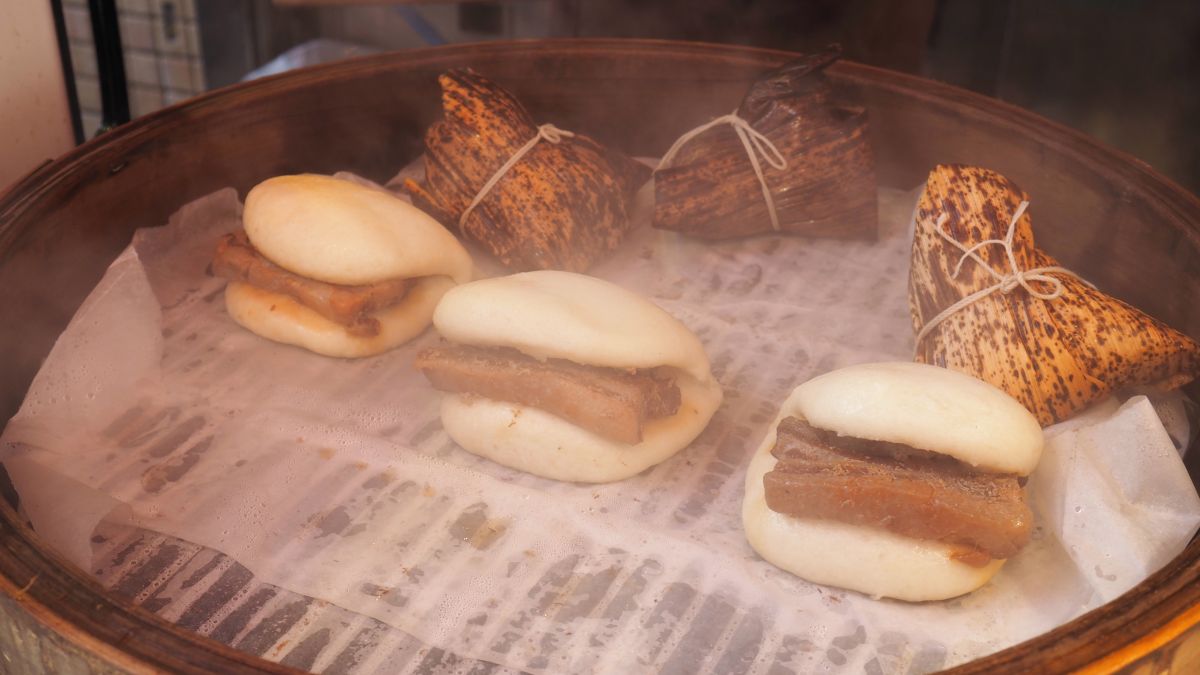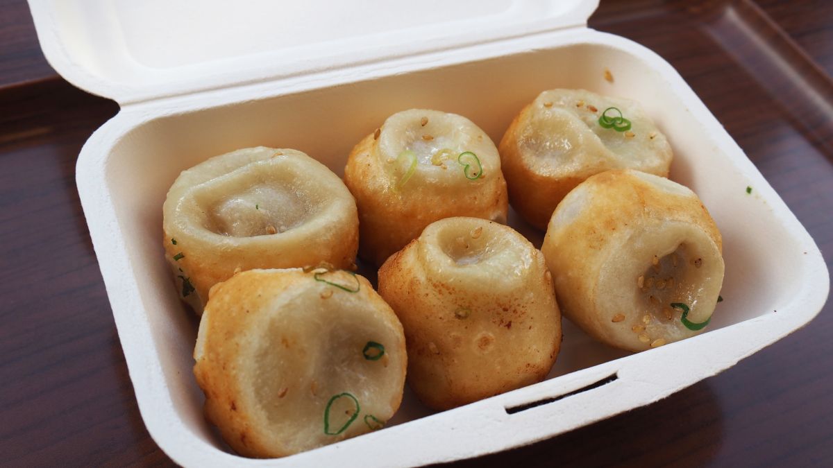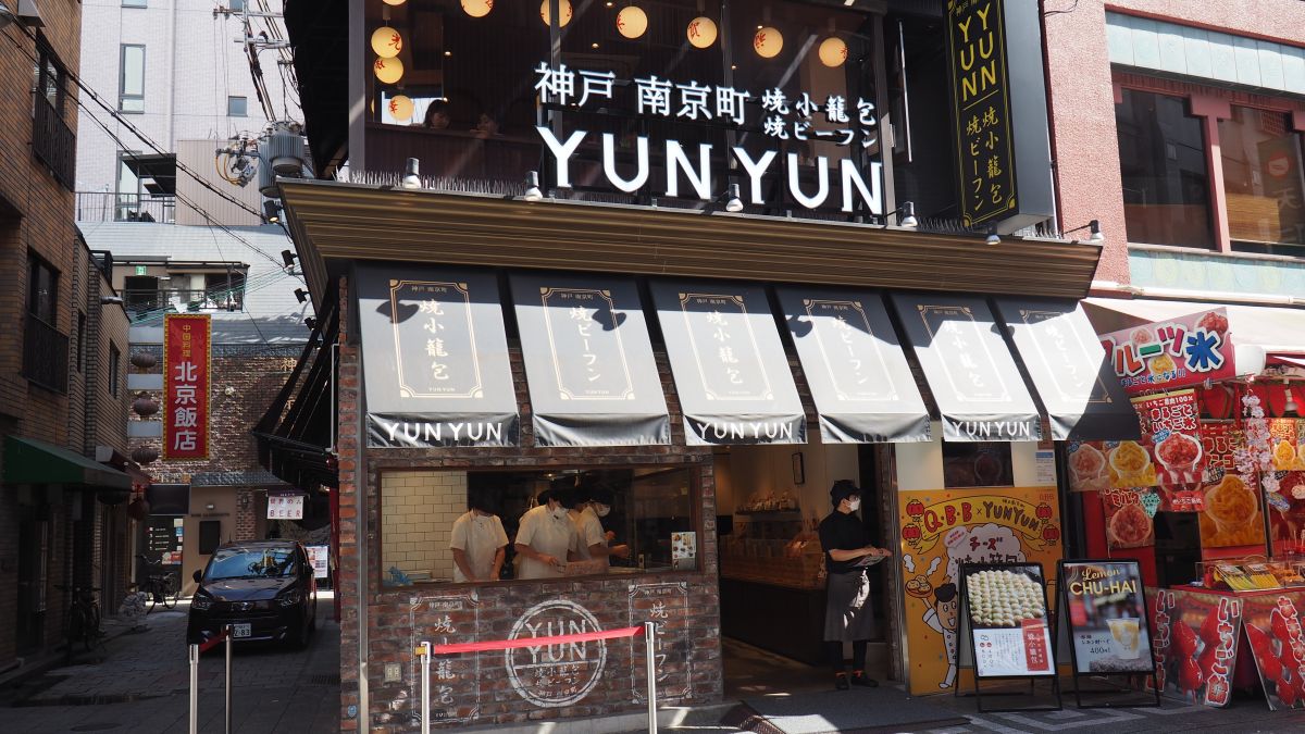 続いて訪れたのは、「天獅堂」の斜め向かいにある「YUNYUN」。焼ビーフンでおなじみの⾷品メーカーのケンミン⾷品が運営するこちらの店舗では、ビーフン類のほかに、汁なし坦坦めんや魯⾁飯など、さまざまな軽食メニューを揃えていますが、必食メニューは、やはり名物の「焼小籠包」3個400円。