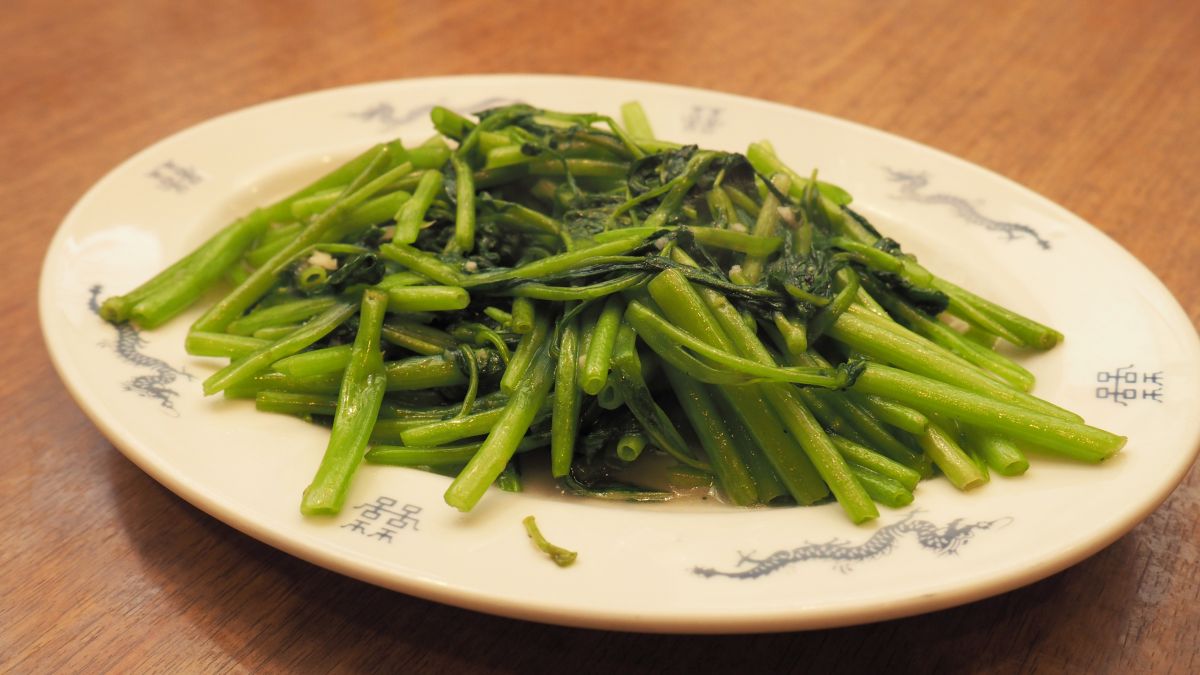 色鮮やかな「空芯菜の炒め」1600円は、ほどよい塩気とシャキシャキした歯ごたえが相まって、いくらでも食べられそうです。味付けは、しょうがとニンニクの2種類から選ぶことができます。
