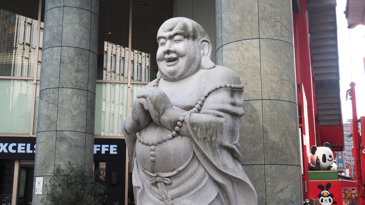長安門の近くには、日本でもおなじみの七福神の布袋様が。布袋様はその昔、中国に実在したといわれる僧侶で、その生涯に謎が多いことから、「弥勒菩薩の化身なのでは?」とも言われているそう。ふくよかな姿は見ているだけで心がなごみます。