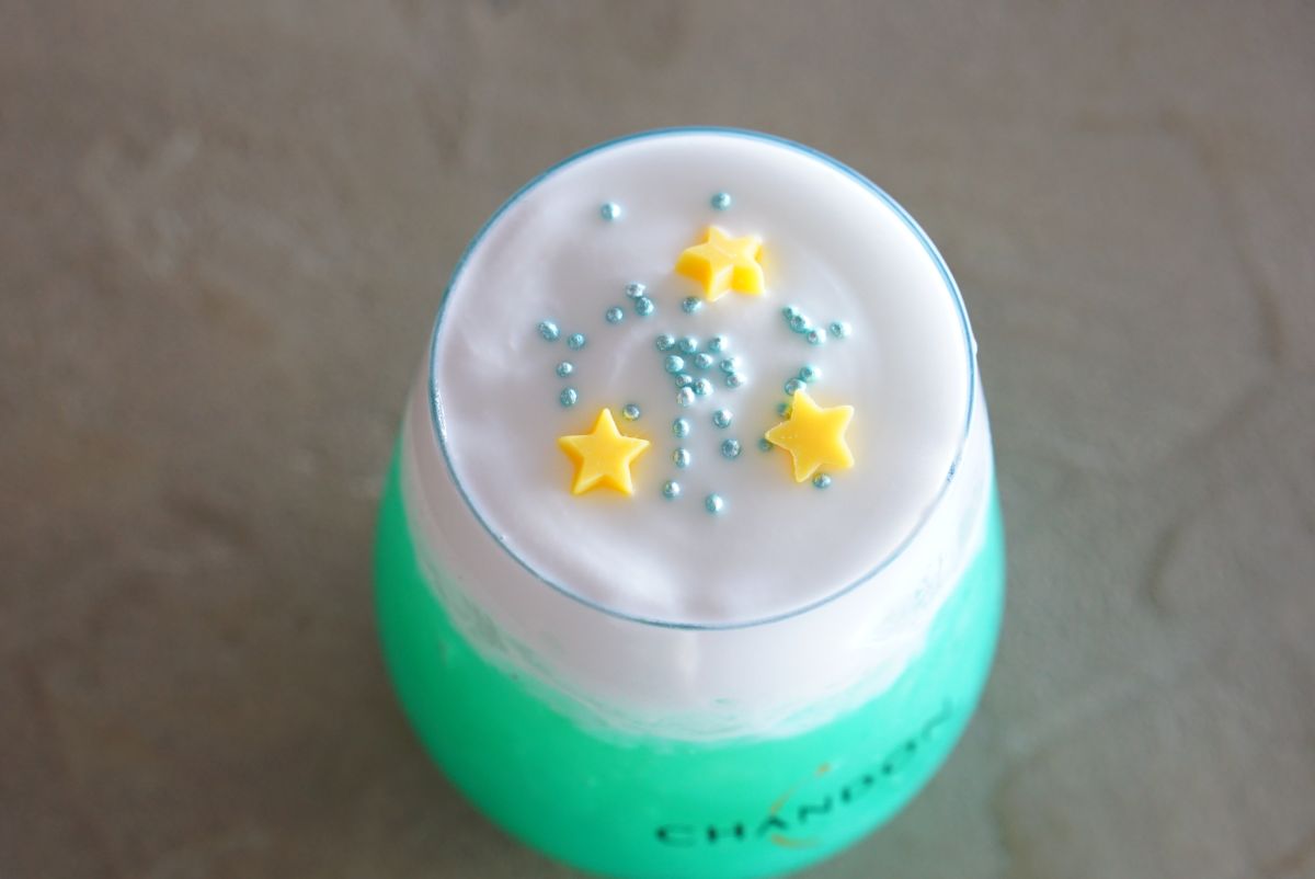 オリジナルカクテルも必見。「スカイビュー」はスパークリングワイン「CHANDON」をベースにしたカクテルで、ブルーパインと雲に見立てたカルピスムースが2層になっています。星屑のような星形のチョコレートがトッピングされているのがとってもキュート。パインのさわやかな酸味とカルピスムースの甘さのバランスがちょうどよく、すっきり後味さわやかです。ノンアルコールにすることも可能です。