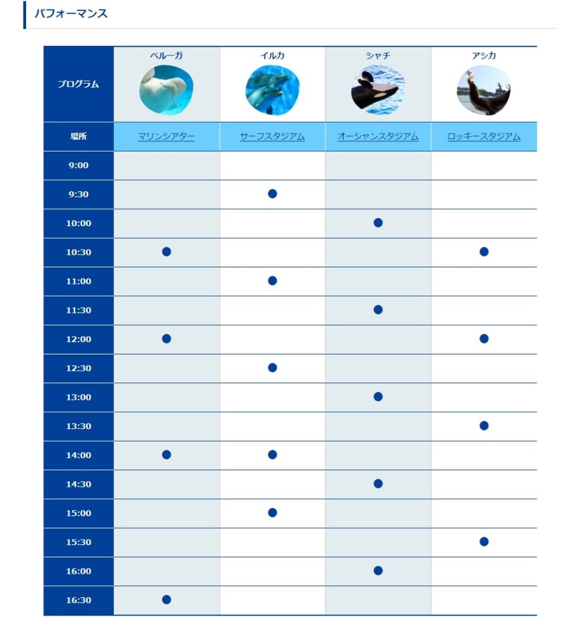 ベルーガから始めて、イルカ→シャチ→アシカと順番に移動すれば効率よく見ることができます。ただし、長期休暇中の繁忙期や週末などには早めに席が埋まってしまうこともあるので、パフォーマンスをひとつ飛ばして、早めに次のパフォーマンスに移動しておくといい場合も。