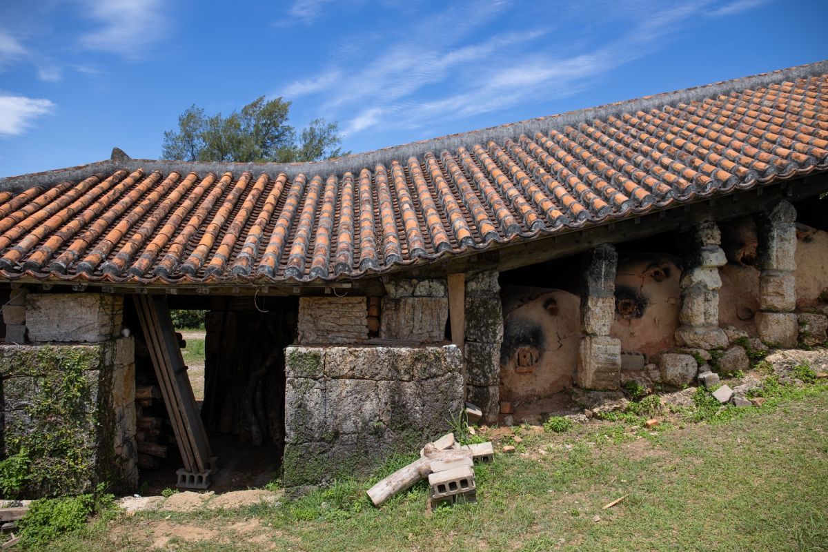 そんなやちむんの里には4つの登り窯がありますが、シンボルとなるのは、やちむんの里の中央にある赤瓦の屋根と石積みの壁でできた長さ25mの大きな登り窯。1980年に4名の作家・金城明光(きんじょうめいこう)さん、玉元輝政(たまもとてるまさ)さん、大嶺實清(おおみねじっせい)さん、山田真萬(やまだしんまん)さんが共同で作り上げた窯です。