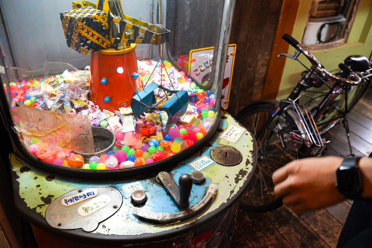 こちらはなんと、日本最古と言われるUFOキャッチャー1回10円。今のものより小さなサイズで、かわいらしいですね。制限時間の1分以内に、レバーでアームを動かして景品をつかみ取るのですが、この加減がなかなか難しい・・・!館内でも人気のゲームなので、混み合う時期は順番待ちの列ができることもあるそうです。