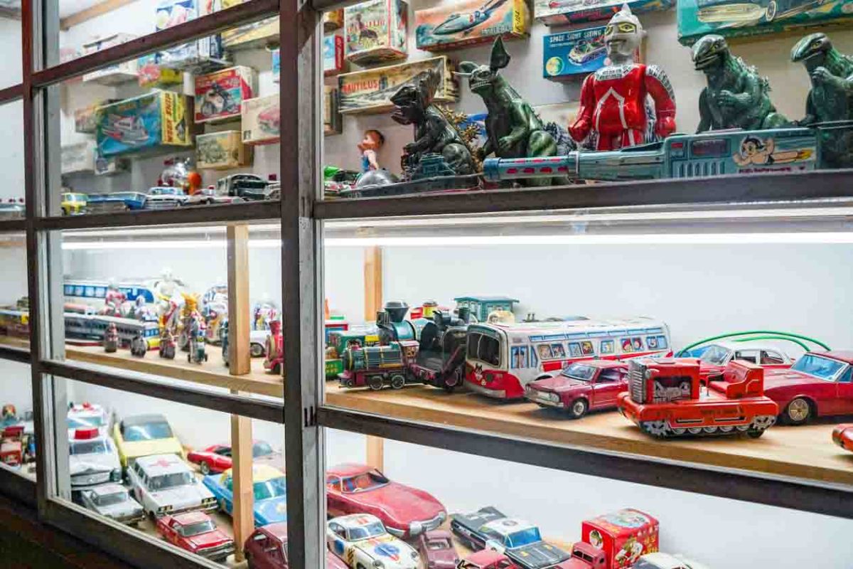 フロントで受付を済ませたら、早速館内へ。まず迎えてくれるのは貴重なブリキの乗り物や、通称“ソフビ”と呼ばれるソフトビニール製の人形などのおもちゃ。自動車やバス、電車などのブリキの乗り物のおもちゃは、カラフルな色合いが楽しく、細かな部分も精密に描かれています。