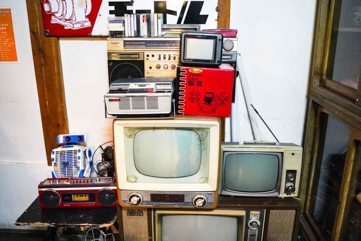 テレビゲームのある2階から再び1階に戻って、昭和のお店を再現したブースへ。電気屋さんには、古いテレビやラジカセが置いてあるのですが、今のものにはない配色がかえってオシャレに見えます。