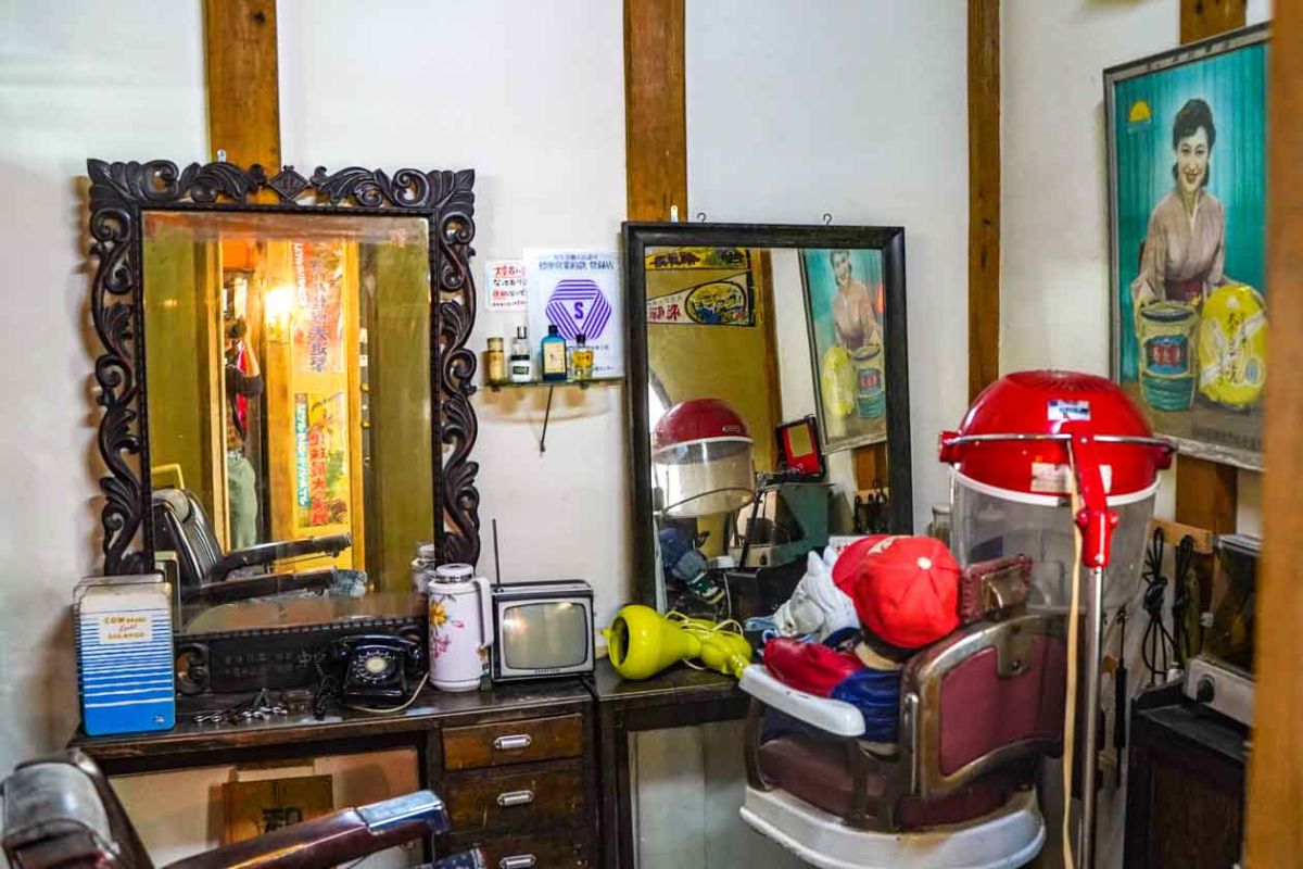 こちらは床屋さん。鏡やデスクも木製であたたかみがあって、今とはかなり違った雰囲気です。右手前の赤い機械は、昭和の床屋さんや美容室で欠かせなかったサロンドライヤー。当時は髪をカーラーで巻いてから、このドライヤーに入って髪をセットしていたんです。