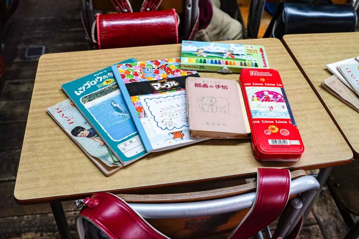 机の上には教科書や、ノート、筆箱といった勉強道具も。実際に当時使用していた教科書やノートは、書き込みなどがあってじっくり読みたくなります。
