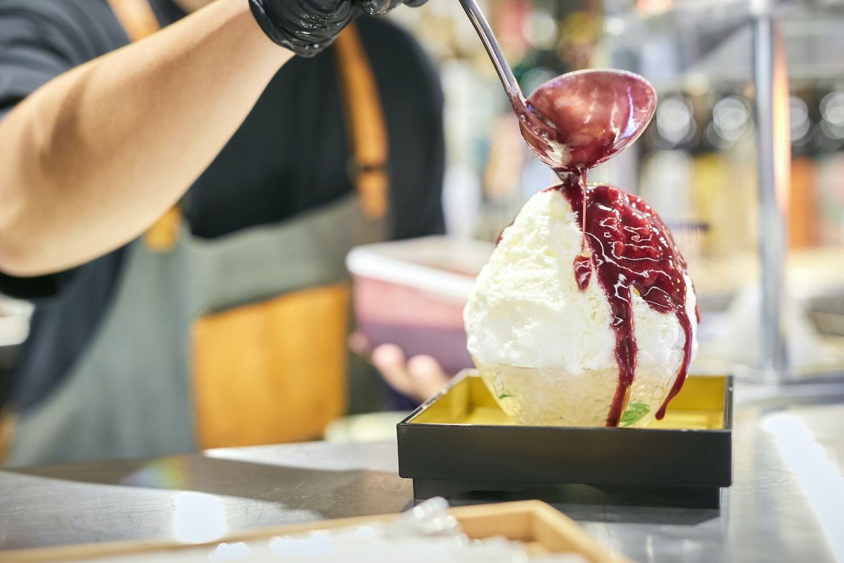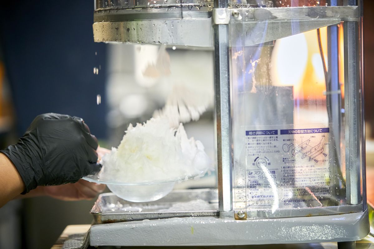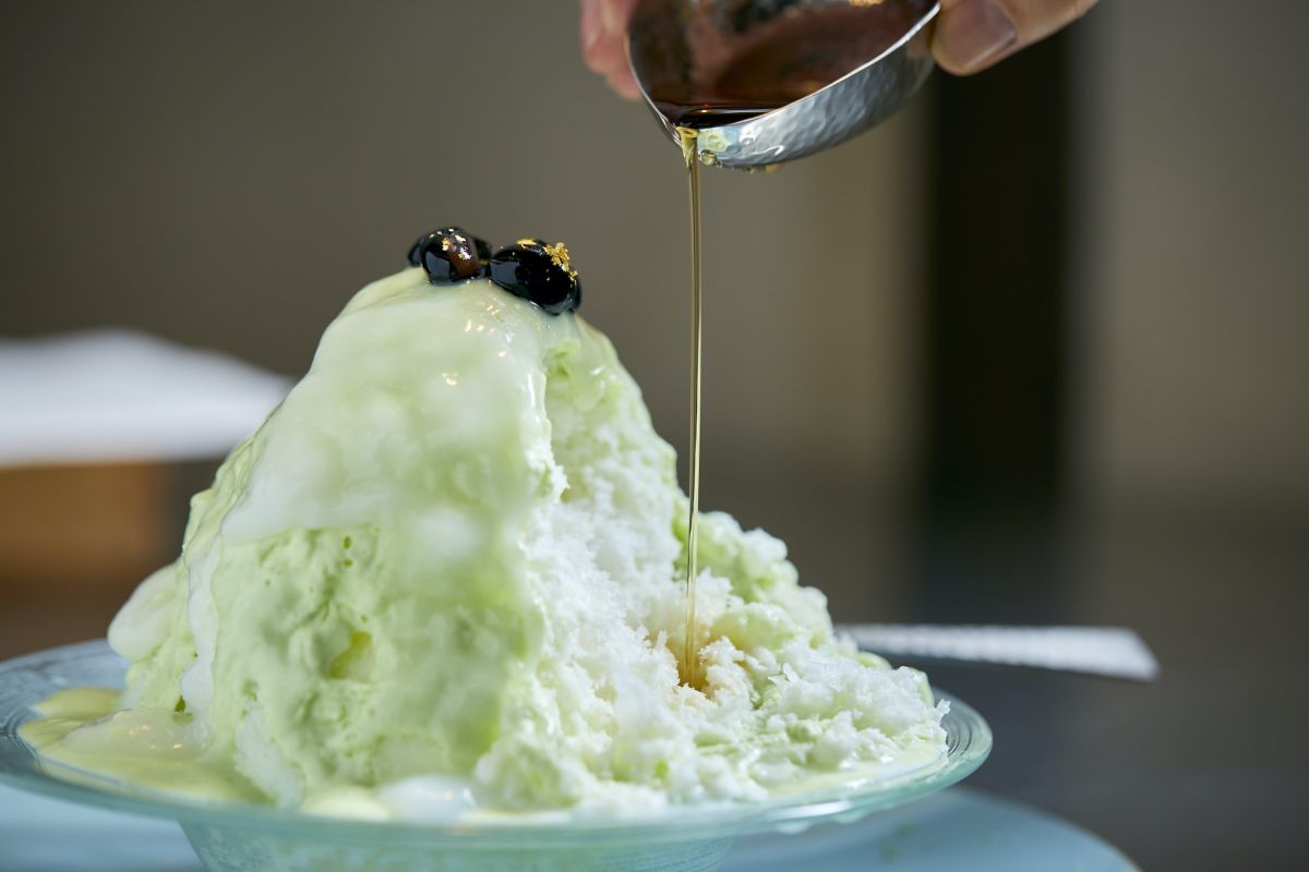 氷を削った上に、チーズミルクのシロップをとろりとかけて、白味噌のパンナコッタを置いてさらに氷を削ります。シロップやトッピング選びは、「京都の調味料」「発酵食品」「乳製品」がキーワード。とろみのある乳製品のシロップは、かき氷に合うように通常の味の濃さの1.2倍に仕上げているそうです。