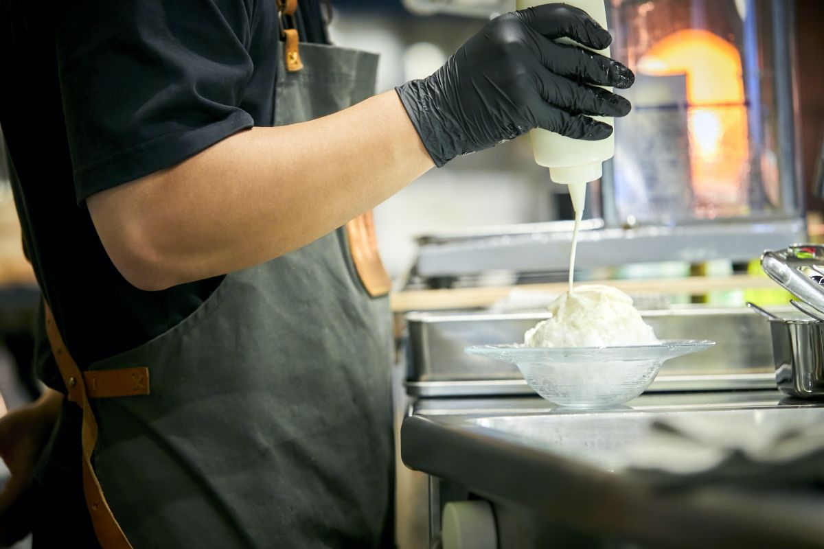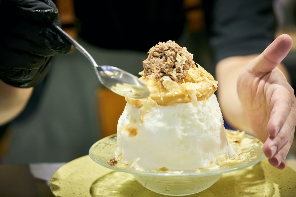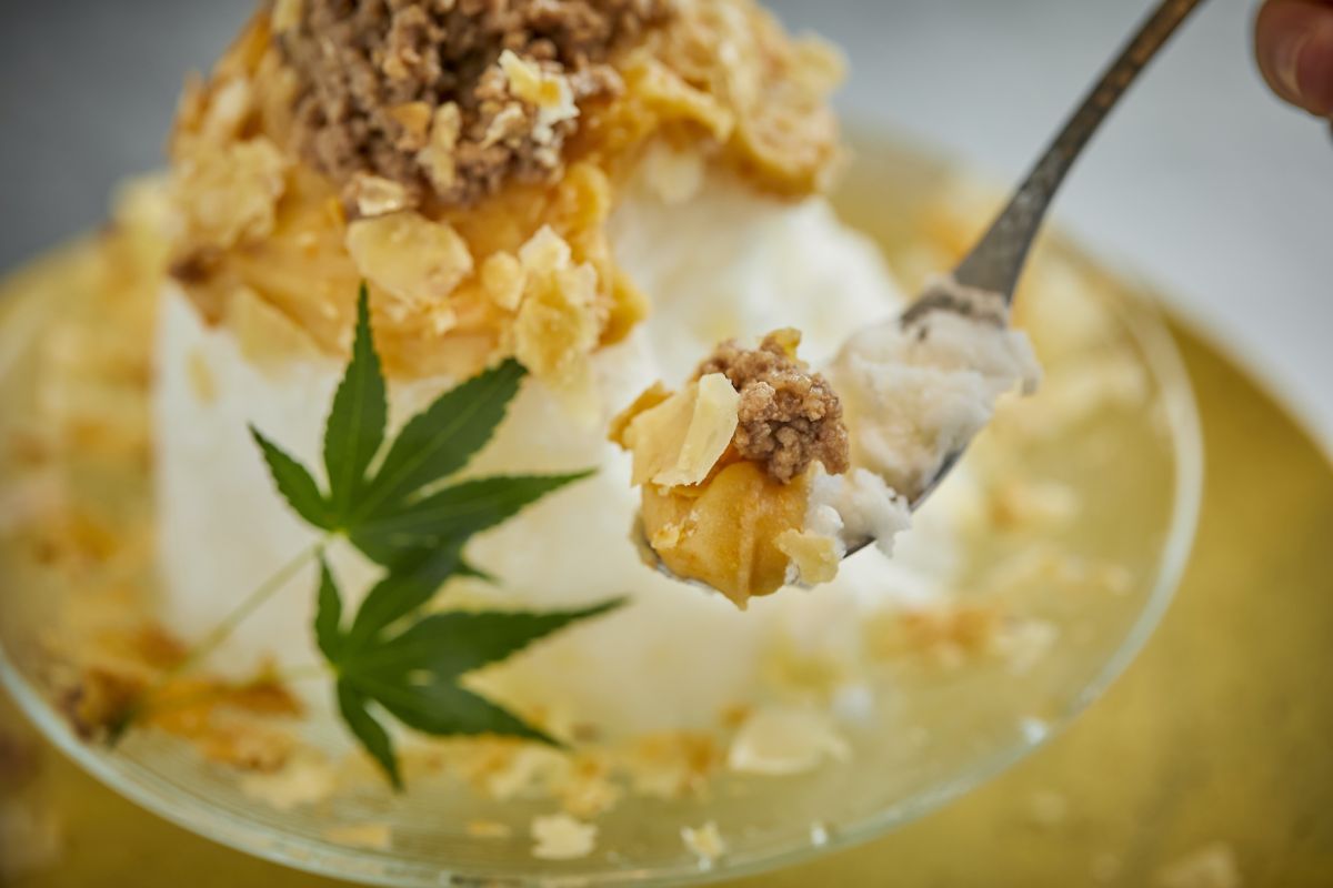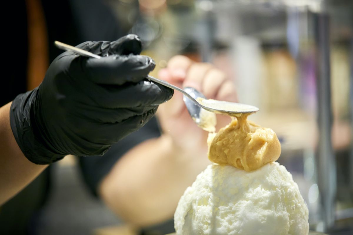 氷を削った上に、チーズミルクのシロップをとろりとかけて、白味噌のパンナコッタを置いてさらに氷を削ります。シロップやトッピング選びは、「京都の調味料」「発酵食品」「乳製品」がキーワード。とろみのある乳製品のシロップは、かき氷に合うように通常の味の濃さの1.2倍に仕上げているそうです。