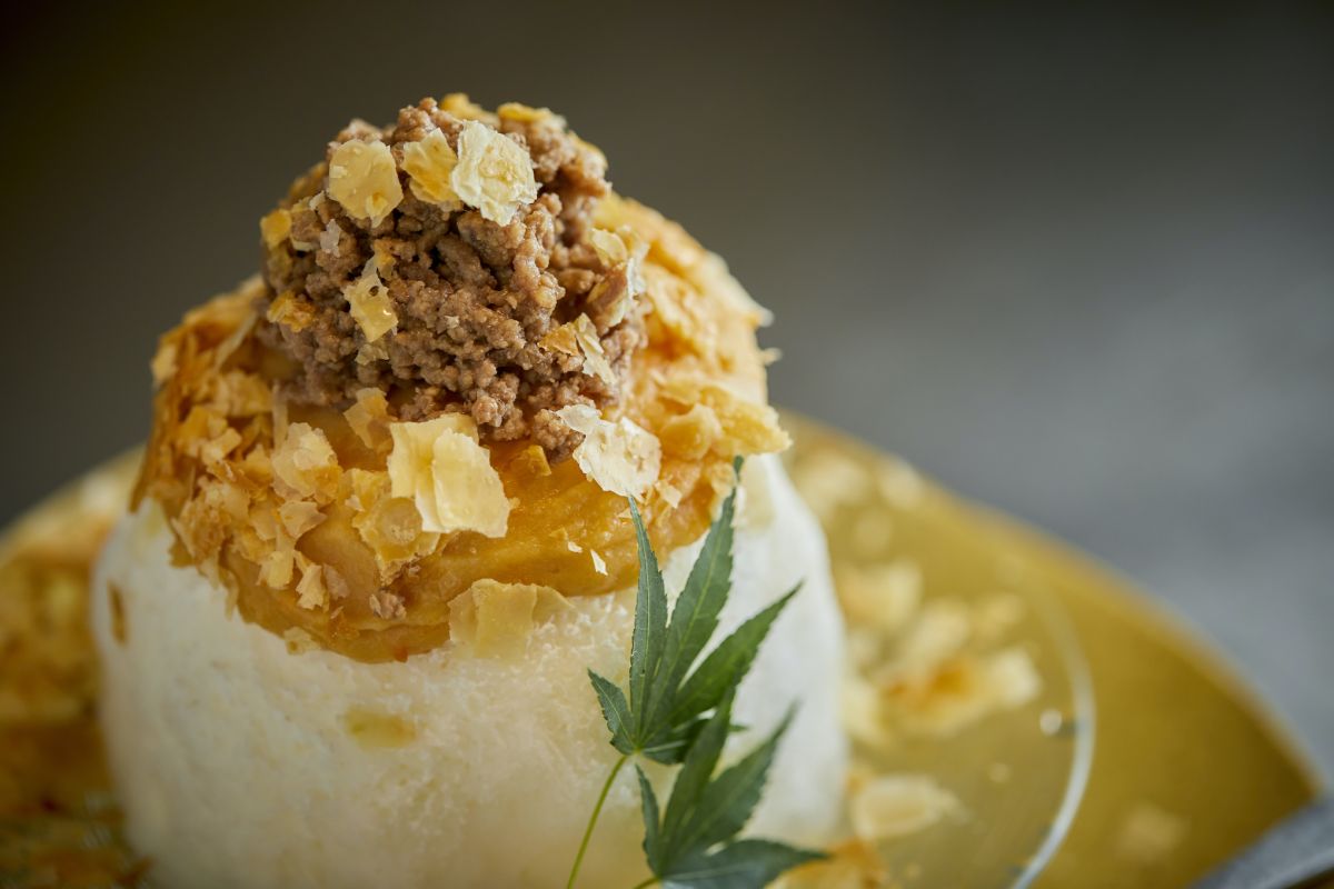 まるく盛った氷の上に重ねるのは肉じゃが。煮つけた肉じゃがの肉を抜いたものをマッシュして、ペーストに。煮汁がじんわり染み込んだじゃがいもたちのペーストが氷の上に盛られます。