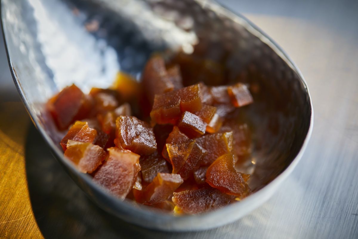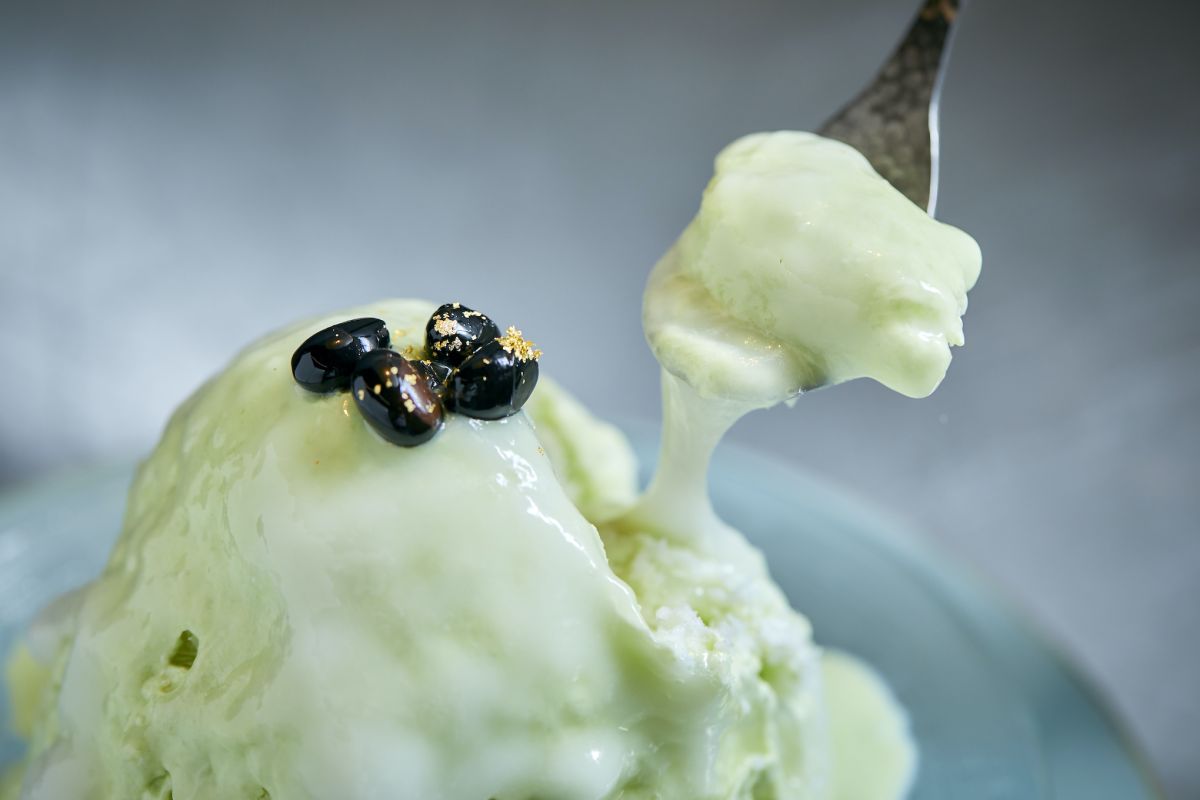 ベースになるのは、こちらもチーズミルクと白味噌のパンナコッタ。味噌は、著名な料理人たちが指名買いする山利商店の白味噌を使用。京都市内でもごく限られた場所でしか買えない希少な味噌です。
