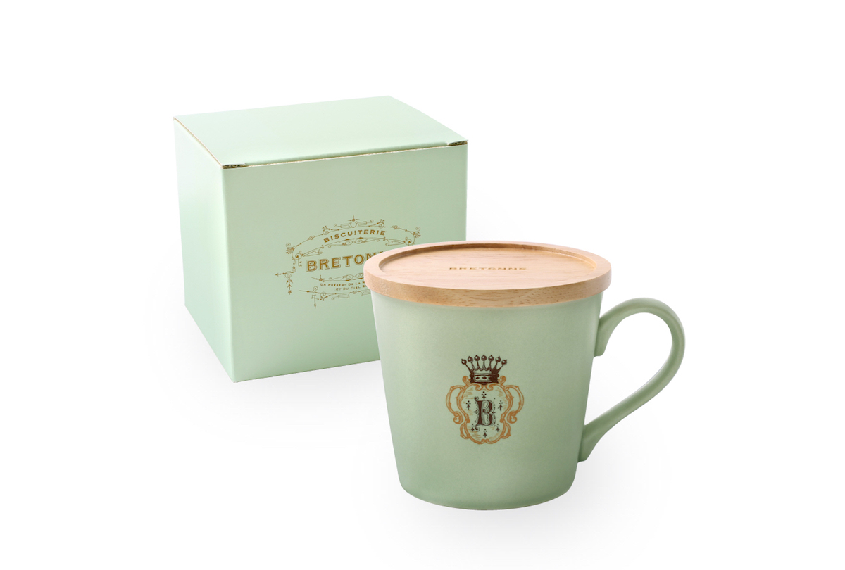 マグカップは岐阜県多治見市の工房でひとつひとつ作られた上質な多治見焼の品です。マットな質感の落ち着いたブルトンヌグリーンにロゴをあしらっています。ブルトンヌのロゴの焼印が入った木製フタがセットになっており、飲み物の保護や紅茶の蒸らし用のフタとしてはもちろん、コースターとして、またクッキーやフィナンシェなどの焼き菓子をのせるプレートとしても使うことができます。