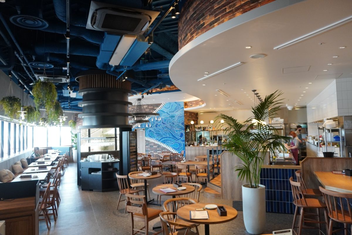 店内に一歩入ると、青と白を基調にした開放的な空間が広がります。客席は店内だけで138席もあります。