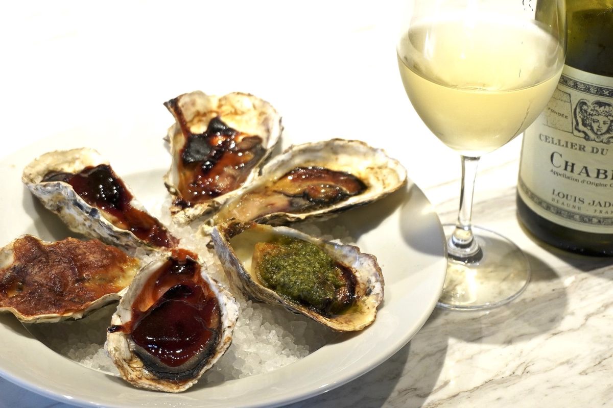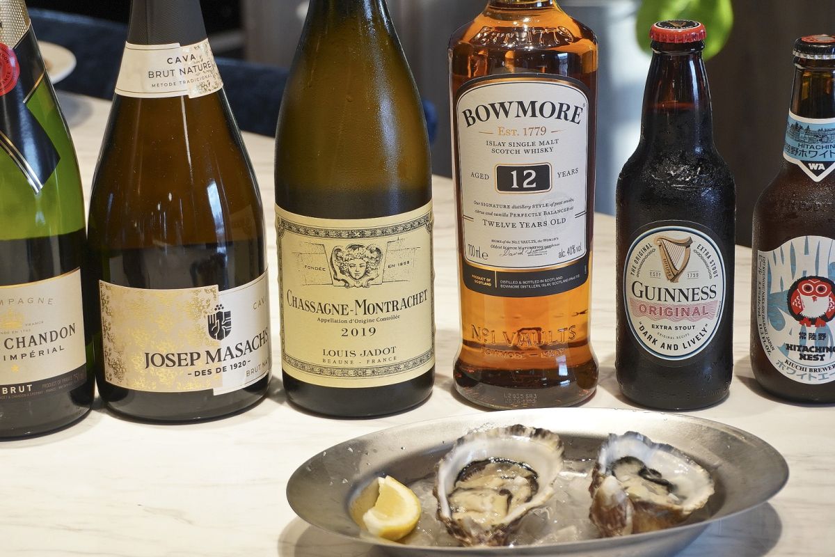 生牡蠣とシャンパーニュは鉄板の組み合わせですが、ここではほかのお酒とのペアリングも気軽にいろいろ試せます。