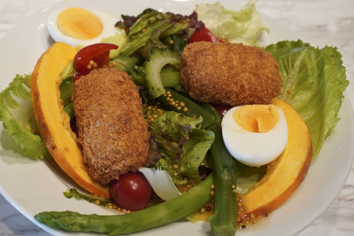 「クワトロチーズコロッケのガーデンサラダ」1100円は、4種類のチーズを包み込んだコロッケを、色鮮やかなサラダと合わせた一品。
