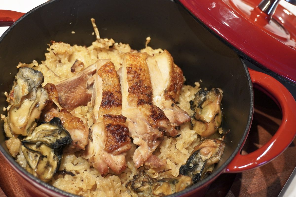 「牡蠣の炊き込みご飯(2人前)」1980円は、牡蠣のおいしいエキスを、米一粒一粒にまとわせ、ゴボウや鶏肉も入った炊き込みご飯。ボリュームたっぷりで、シメにおすすめです。