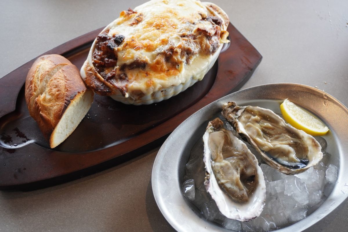 ランチセットにプラス440円で、生牡蠣2ピースを追加することができます。 お昼から生牡蠣なんて、贅沢気分になれますね! 写真は「自家製ミートソースの牛すじラザニア」。がっつりボリューミーな一品です。