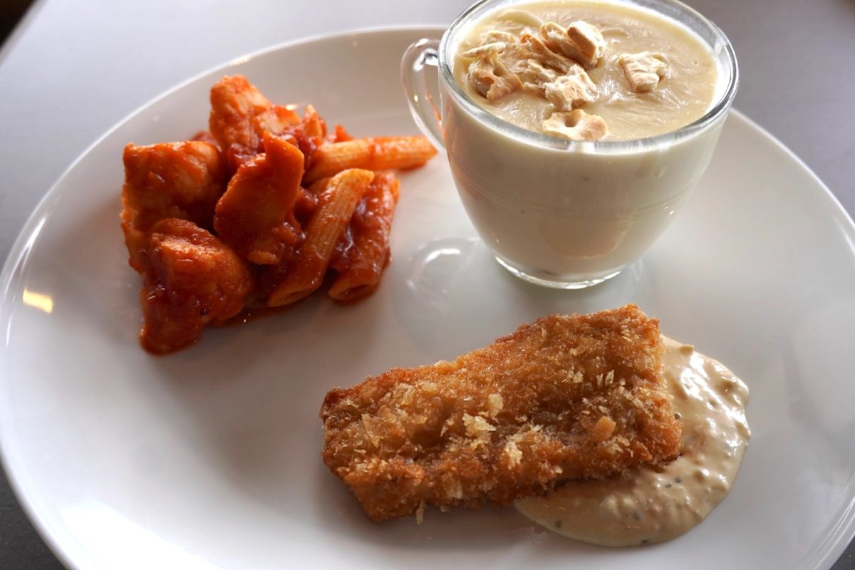 写真は「クラムチャウダー ボストン風」で、大粒の牡蠣がゴロゴロ入った濃厚なクラムチャウダーと、白味魚のフリット、ペンネがワンプレートに。これにバゲットとドリンク(コーヒー、紅茶、オレンジジュース、ウーロン茶の中からチョイス)がセットになっています。