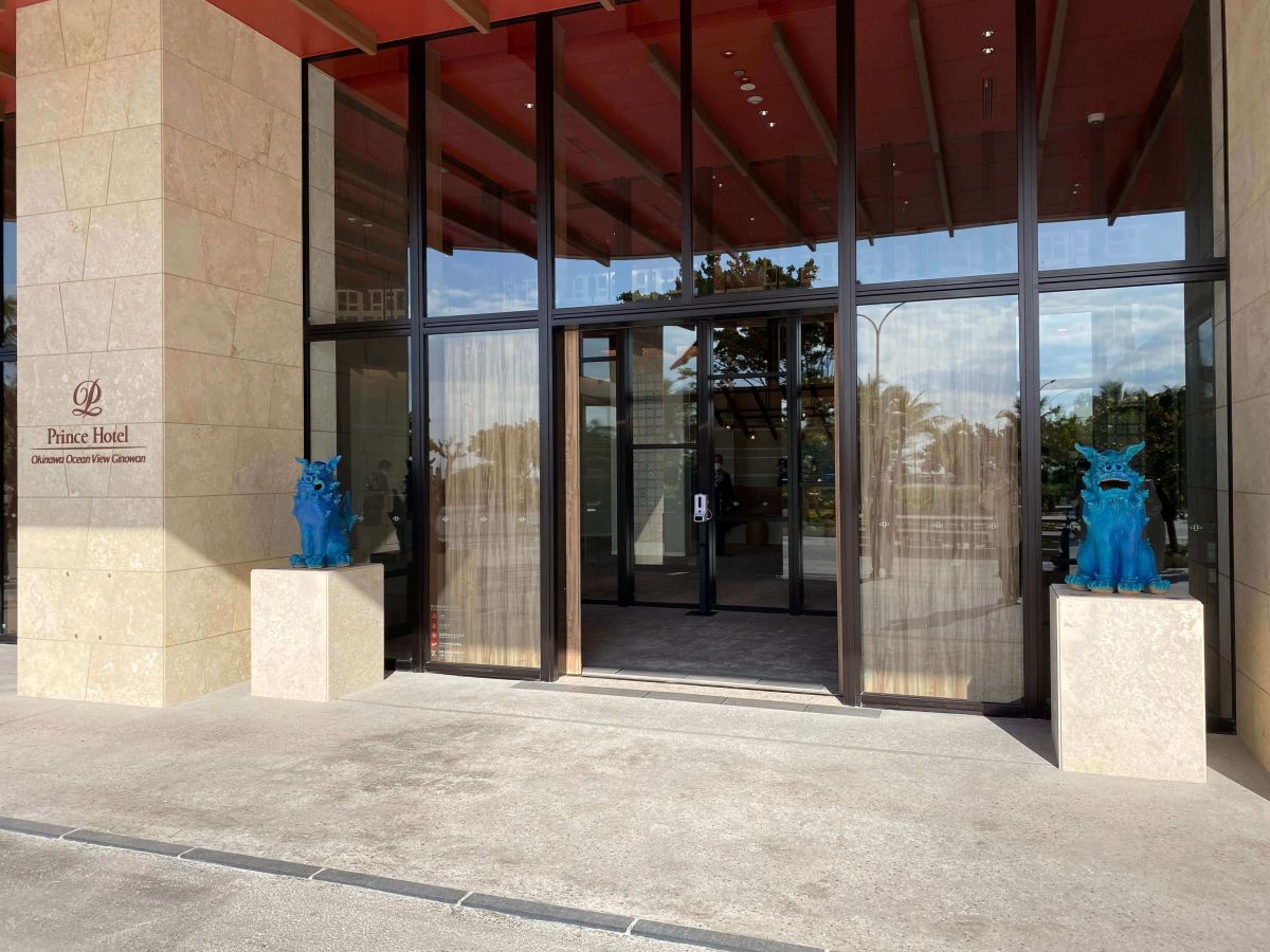 沖縄のシーサーといえば弁柄色(べんがらいろ)が多いですが、ホテル入口では青色のシーサーがお出迎えしてくれます。海風を浴びて青くなったみたい。